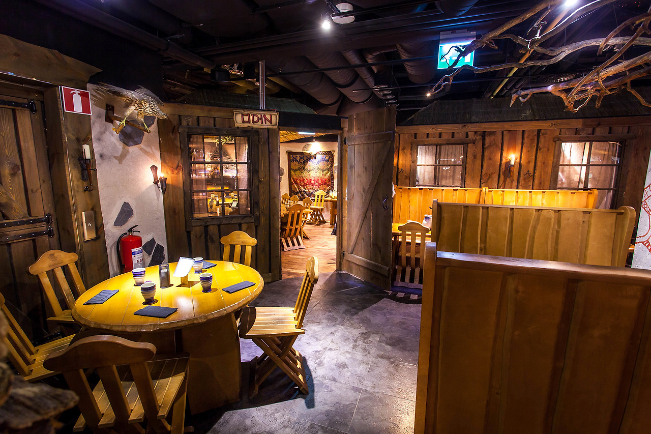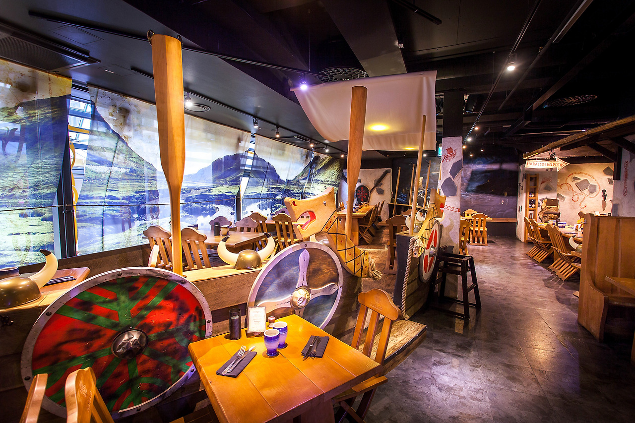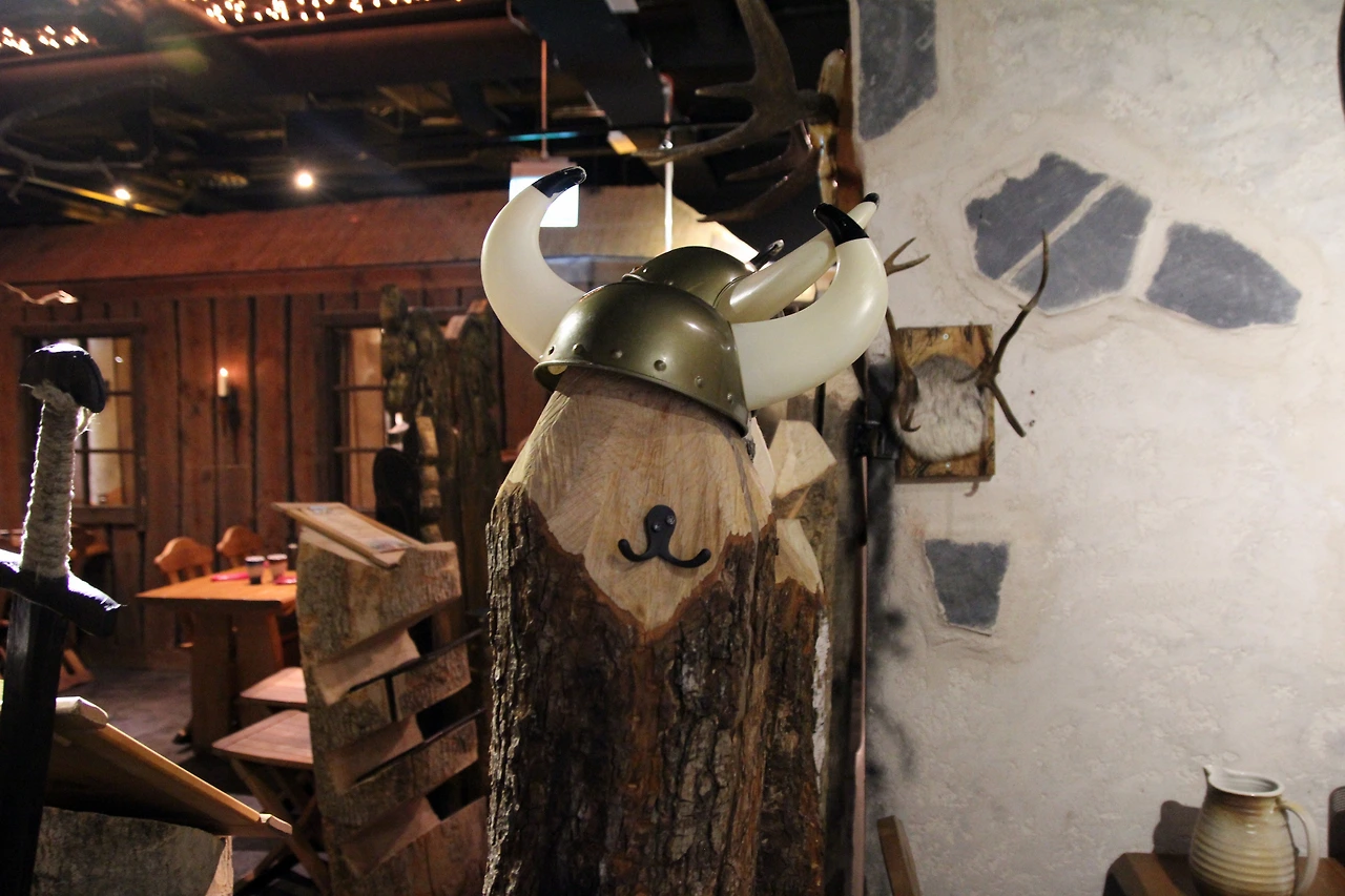 바이킹 분위기로 꾸며진 레스토랑, 플라스틱 바이킹 모자를 쓰고 식사를 즐길 수 있다.