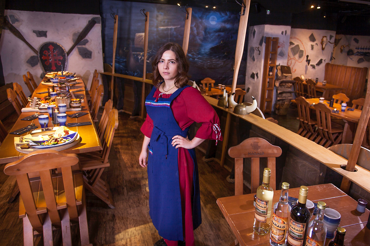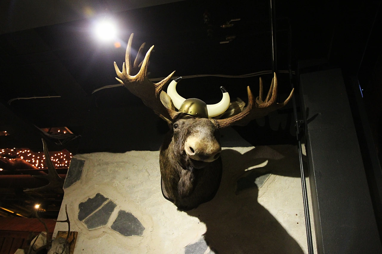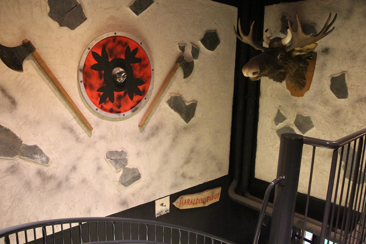 바이킹 분위기로 꾸며진 레스토랑, 플라스틱 바이킹 모자를 쓰고 식사를 즐길 수 있다.