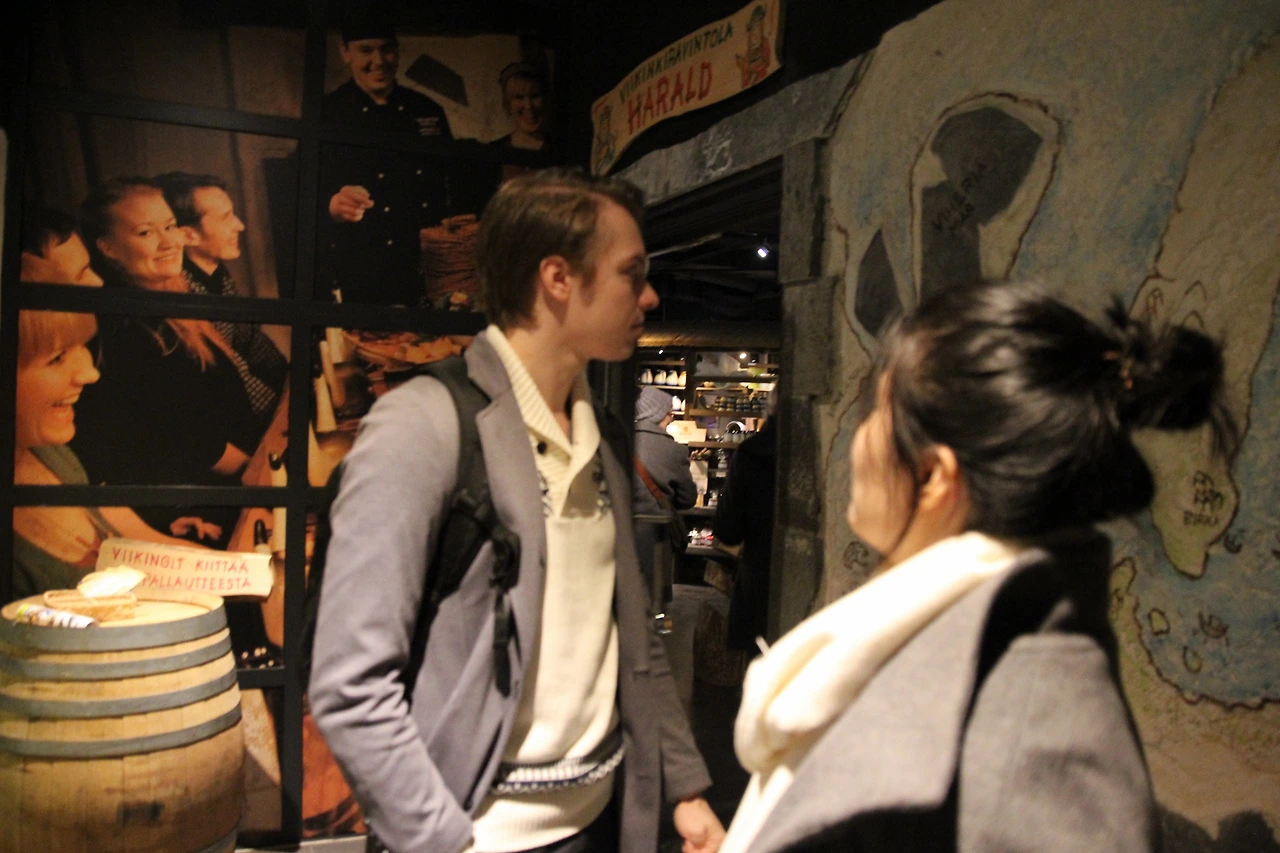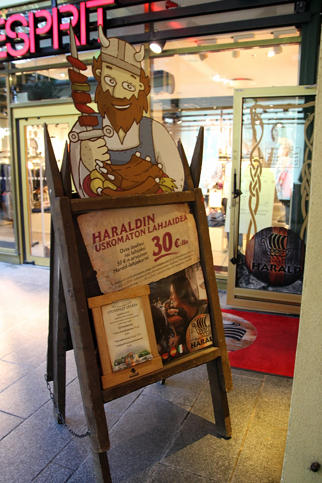 헬싱키 도착 전날 미리 제이드와 바이킹 패밀리 레스토랑에 함께 밥을 먹으러 가자고 약속했다. 제이드가 찾아본 바에 따르면 런치 타임에 가면 저렴하게 크리스마스 런치 스페셜을 맛볼 수 있다고 한다. 혼자 여행을 하다 보면 제일 들어가기 힘든 식당이 패밀리 레스토랑이라 제이드의 제안이 고맙고 반가웠다. 야니와 제이드를 만나 무민 스토어도 들리고 대광장도 들렸다가 셋이서 런치 타임 시작 시간에 맞춰 HARALD 레스토랑을 찾아갔다. 위치는 헬싱키 스톡만 백화점 부근에 위치하고 있어 찾기에 어렵지 않았다. 1층에 HARALD 입간판이 있어 옆의 문을 통해 2층의 레스토랑으로 들어갈 수 있었다. 계단을 올라가는 곳부터 인테리어가 남달랐다. 순록 마스크상에 도끼와 바이킹 방패, 벽면을 채운 바이킹 시대의 지도에 들어가기 전부터 입이 떡 벌어졌다. 아마 혼자 왔다면 계단에서 기웃거리다가 뒤를 돌아 다른 식당에 갔을지도 모르겠다.