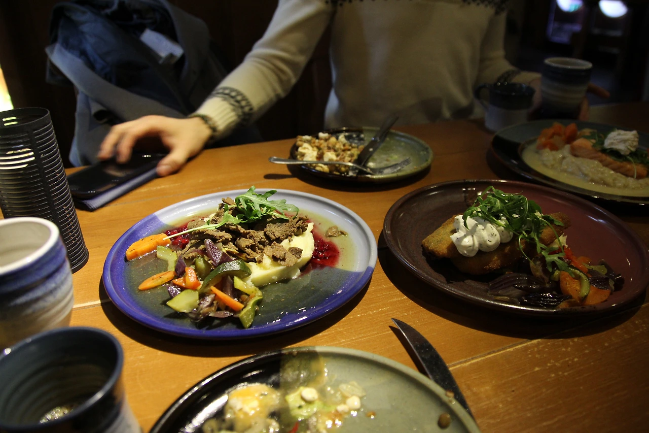 메인 메뉴의 접시에는 북유럽의 주식인 매쉬드 포테이토가 같이 곁들여져 나왔다. (모든 메뉴에 모조리 다!) 제이드에게 물어보니, 핀란드에서 감자는 우리나라에서 밥과 같은 존재라고 했다. 그래서인지 야니의 외할머니 집에 초대받았을 때도 식사에 감자는 늘 있었다. 셋이서 골고루 맛보기 위해 순록 고기, 청어 튀김, 연어 구이를 주문했는데 연어를 제외하면 두 메뉴는 생경한 메뉴였다.