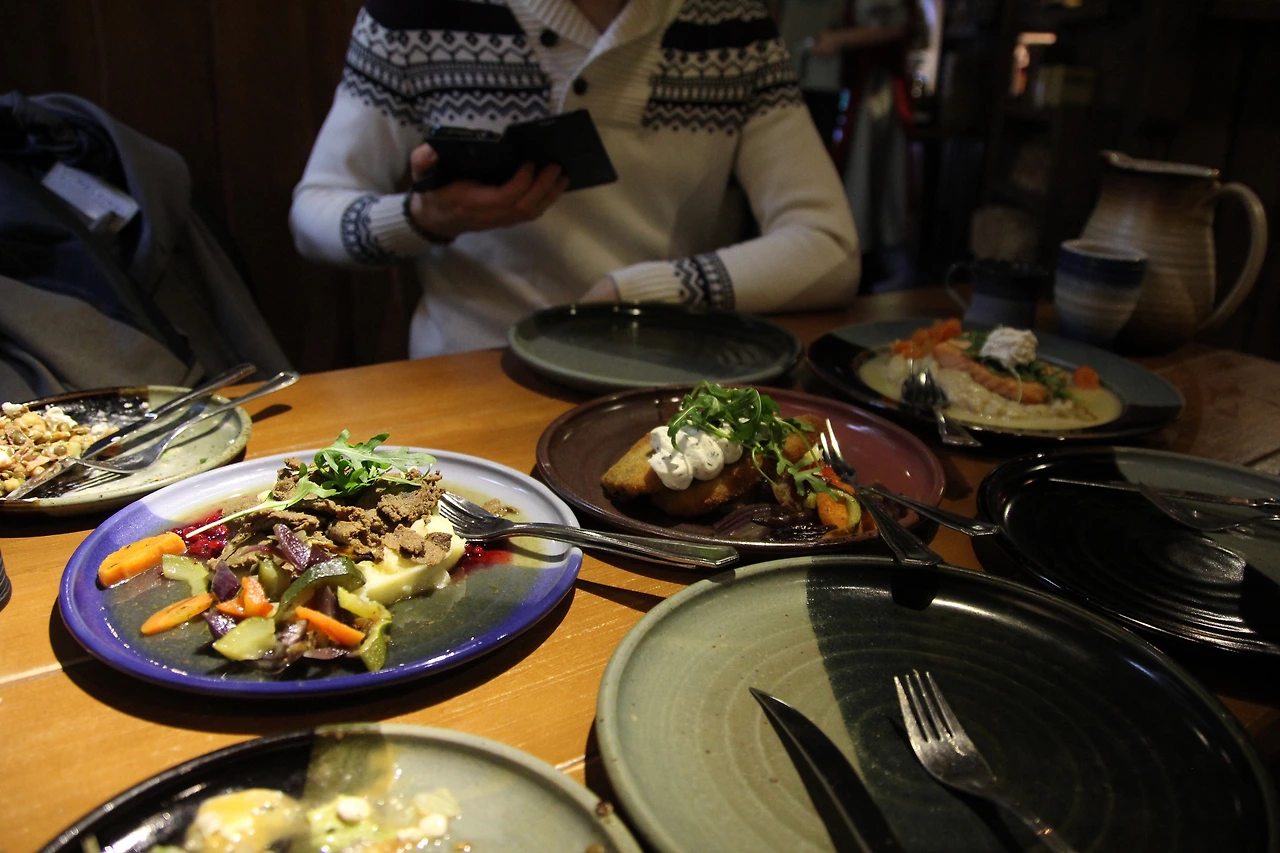 원하는 손님은 준비되어있는 플라스틱 바이킹 모자를 쓰고 식사를 할 수 있다. 그래서인지 가게 곳곳에 모자들이 걸려있었다. 야니와 제이드가 써보라고 이야기했지만 이른 시간이라 사람들도 별로 없는 패밀리 레스토랑에서 혼자 모자를 쓰고 기분을 내기에는 되려 민망할 것 같아 사양했다. 애피타이저를 비우기도 전에 메인 메뉴가 나왔다. 야니와 제이드가 주문 전에 미리 핀란드 레스토랑에서 한국처럼 식사가 빨리 나오길 바라거나 서비스가 좋기를 바라면 안 된다고 알려주었는데 서버가 매우 여유로워 보이는 것을 제외하면 손님이 많지 않아서인지 크게 나쁘지는 않았다.