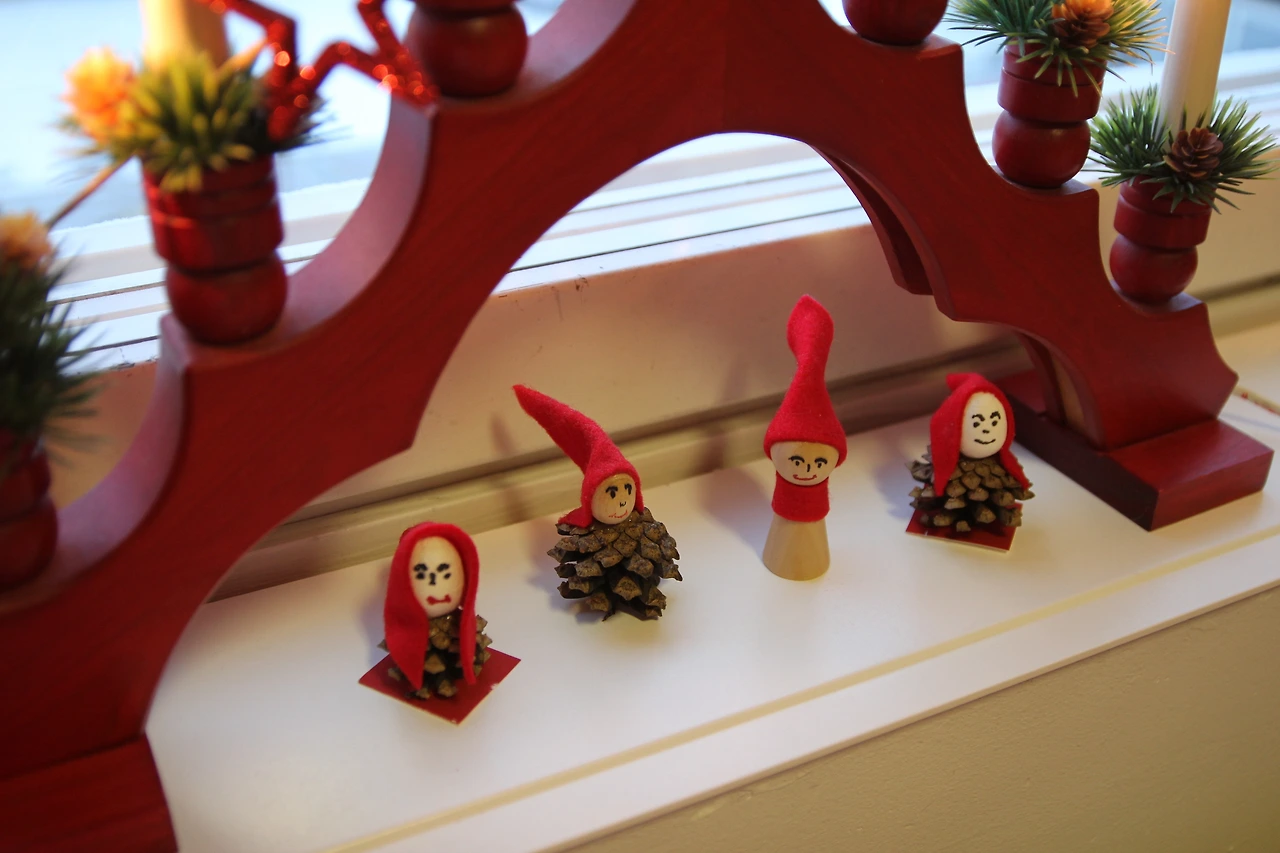 직접 만드신 솔방울 크리스마스 장식들, 어설픈 표정들이 귀엽다.