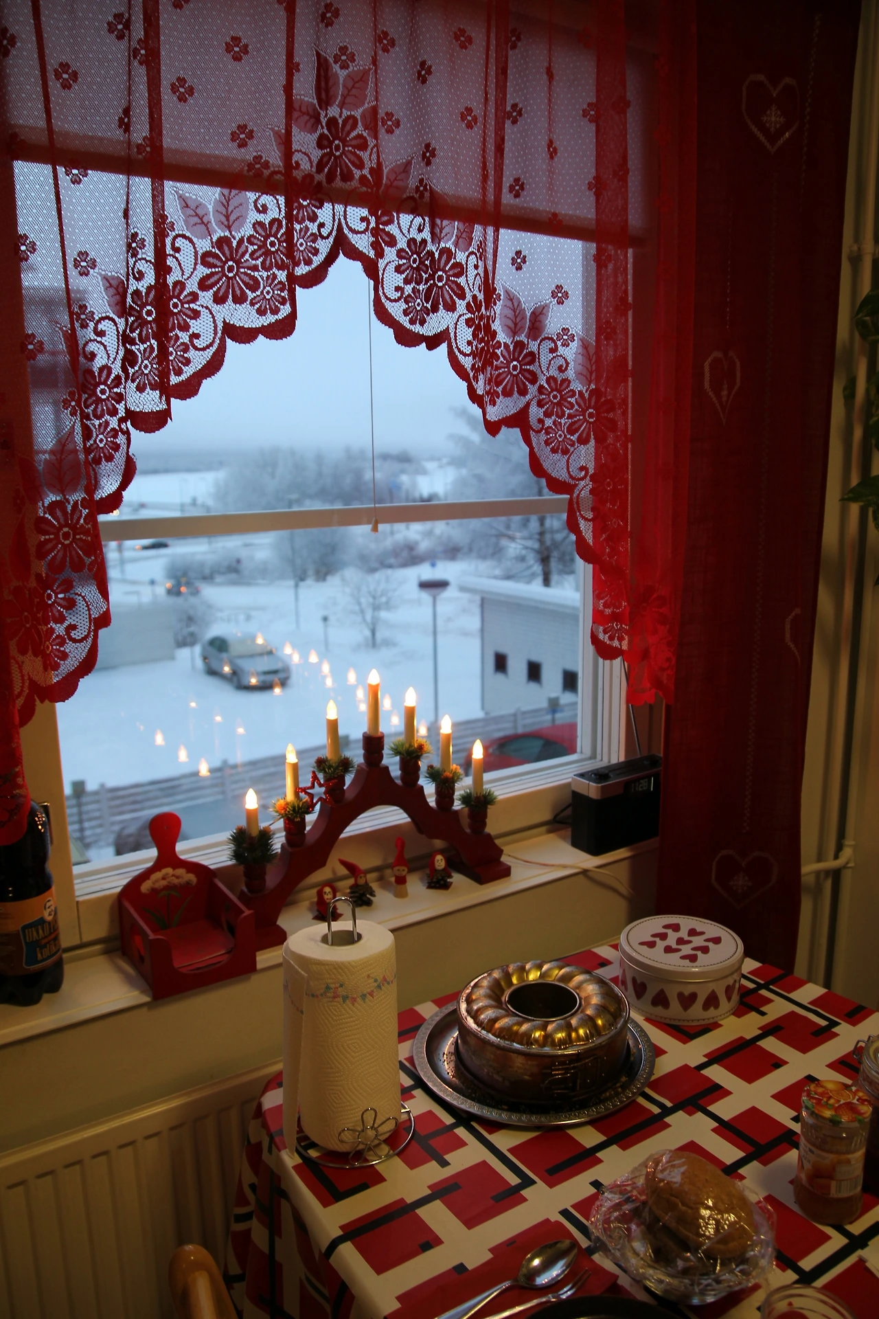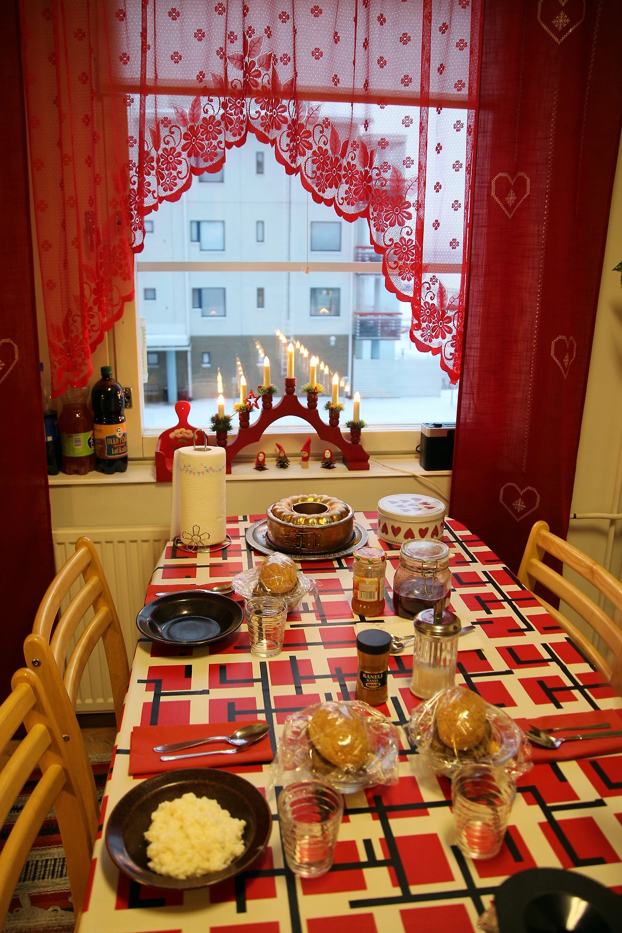긴 시간 동안 달려온 우리를 위해 점심을 준비해두신 식탁은 크리스마스 이브에 맞춰 식탁보도 냅킨도 커튼도 촛불 장식도 예쁜 빨간색이었다. 창 밖으로는 하얀 풍경이 그림처럼 들어왔다. 이게 바로 북유럽의 크리스마스구나 하는 생각에 웃음이 나왔다. 예쁜 모습을 사진에 담고 있으려니 제이드가 밥부터 먹으라고 이야기했다.