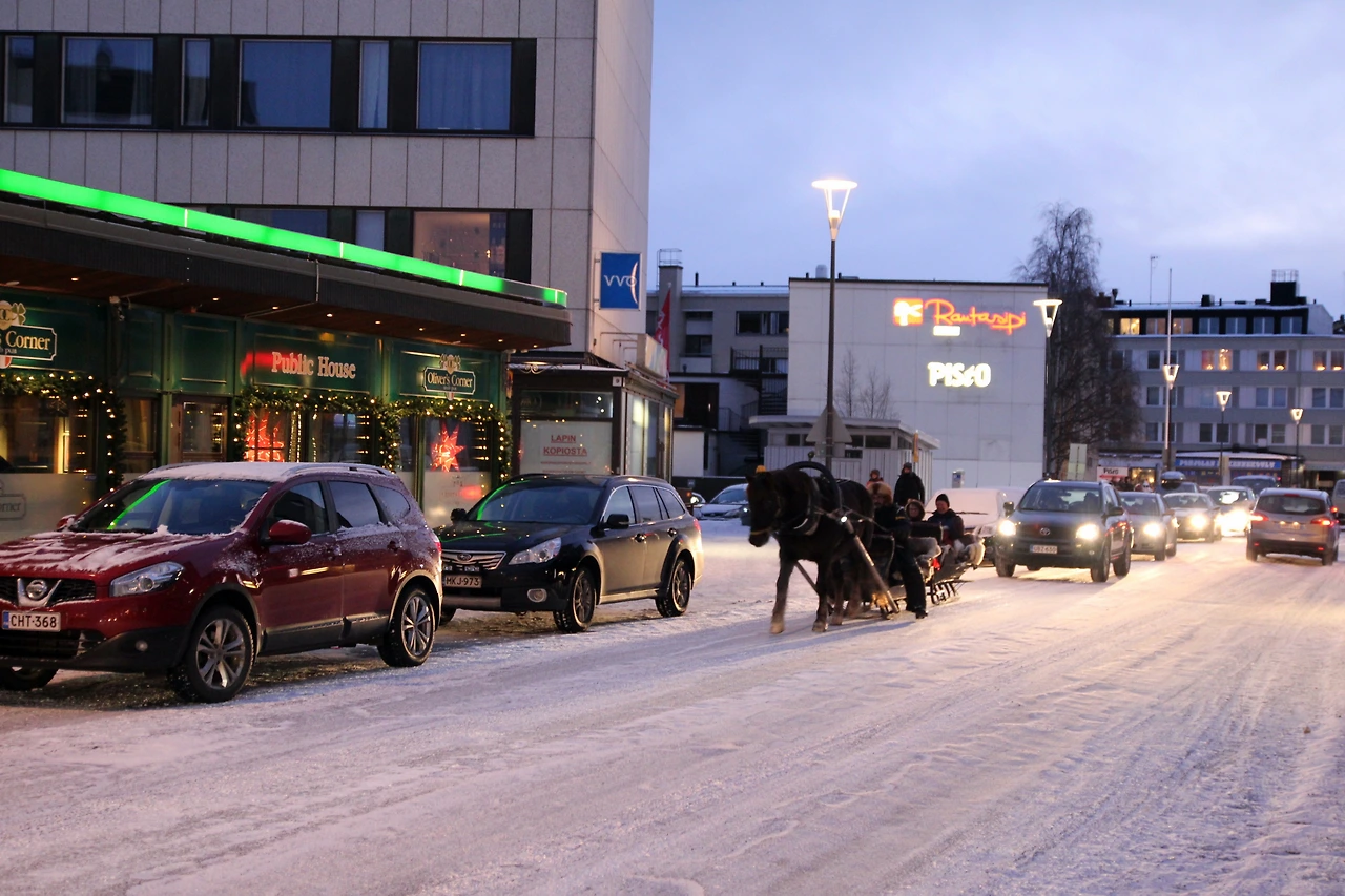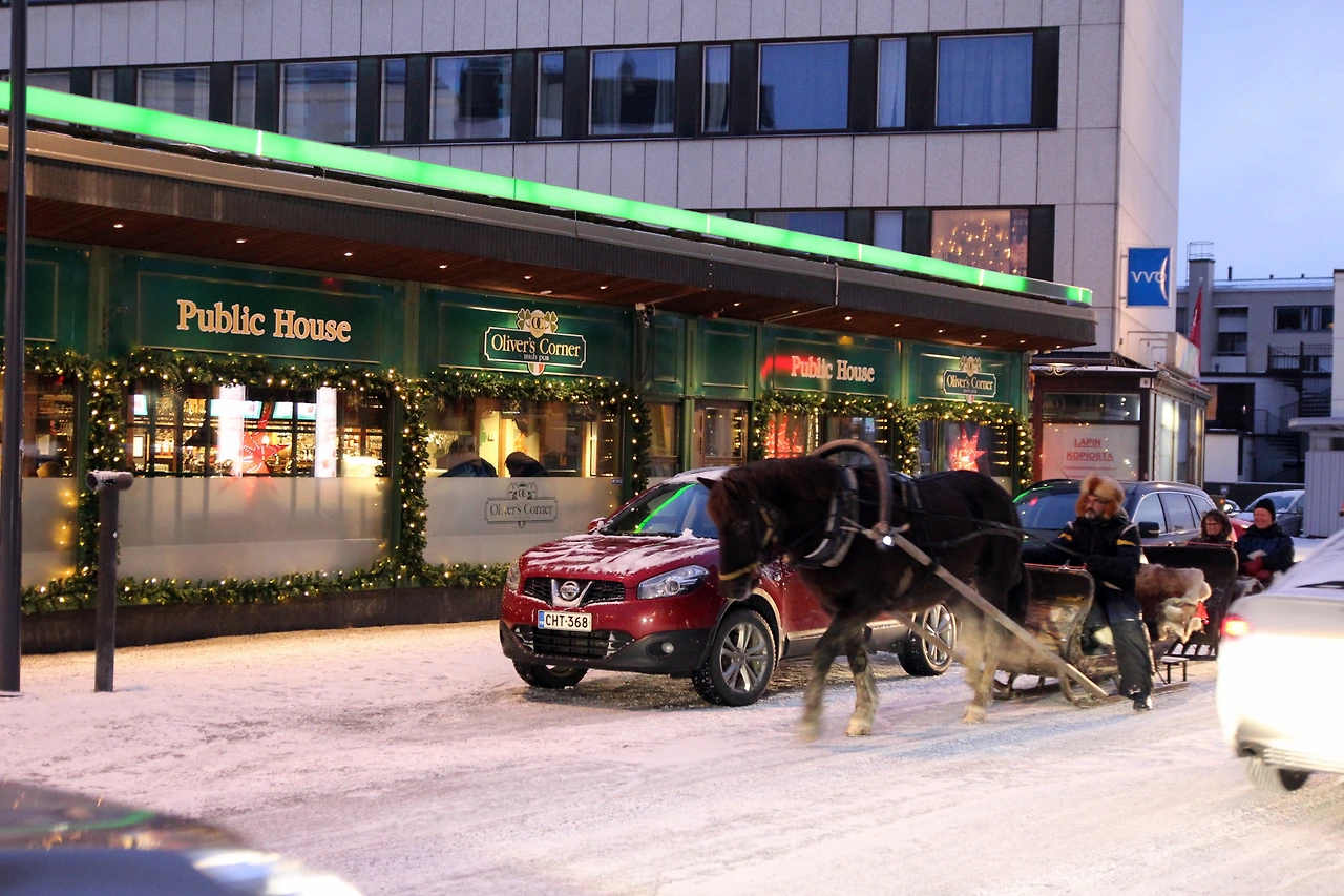 야니의 외할머니 댁에서 점심(핀란드 만찬)을 먹고 시내로 나가자 크리스마스 시즌이고, 또 산타 마을 근처에 있는 로바니에미는 특히나 성수기여서 그런지 사람들이 많이 보였다. 차가 달리는 도로에서는 관광객을 위해 말 썰매가 달리고 있었다. 경주용 말과는 다른 투박한 썰매 말의 모습은 속도는 조금 느렸지만 묵직한 힘이 느껴졌다. 말 썰매를 이용해 아문센에게 남극권 도달을 빼앗기고 결국 돌아오는 길에 조난을 당한 스콧 일행이 어릴 적에는 이해되지 않았는데 실제로 말 썰매를 보니 왜 그런 선택을 했는지 조금은 이해할 수 있었다. (엄청 타고 싶을 정도로 멋지다. )