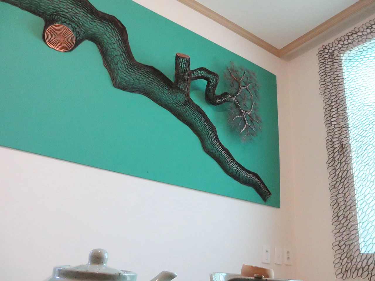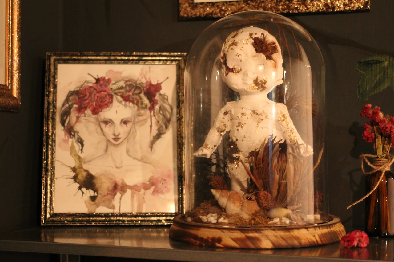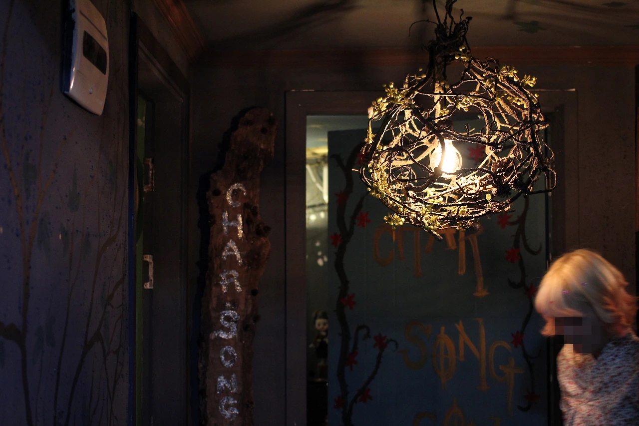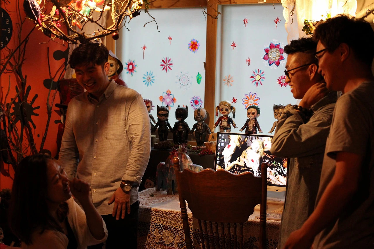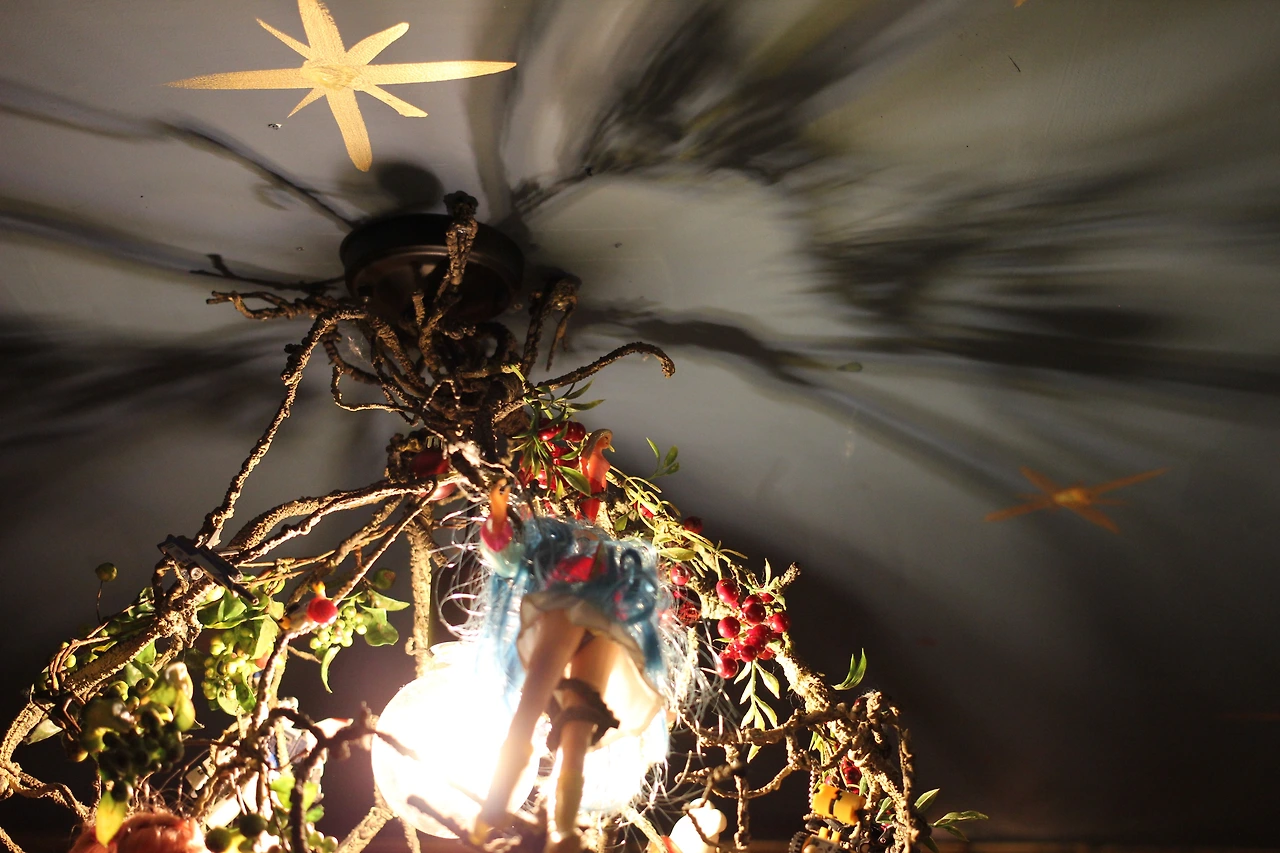 회색 철문을 열어 현관에 들어서자 어두운 색 페인트로 칠해진 벽면과 그 가운데 나무 덩굴을 엮어 만든 커다란 전등이 달랑거린다. 안쪽 큰방에서는 신비로운 음색의 음악이 집안 가득 울리고 있었다. 설명을 위해 대기하시던 작가님이 큰방에서 나와 방문객을 맞이해주셨다. 조금의 빈틈도 없이 음악과 공기, 향 그리고 보이는 모든 것들이 송송 작가님과 한 몸처럼 보였다. 작은 방 창 밖으로는 시시각각 변해가는 불빛이 하얀 인형들을 비추고 있었고 불빛의 변화에 하얀 인형들은 고요한 춤을 추는 것처럼 보였다. 이 곳은 우리가 익숙하게 봐왔던 작가의 집도, 작가의 작업실도, 작품이 전시되는 갤러리도 아니었다. 공간 자체가 작품이고, 작품이 공간 안에서 자신의 자리를 찾은 것처럼 편안해 보였다.