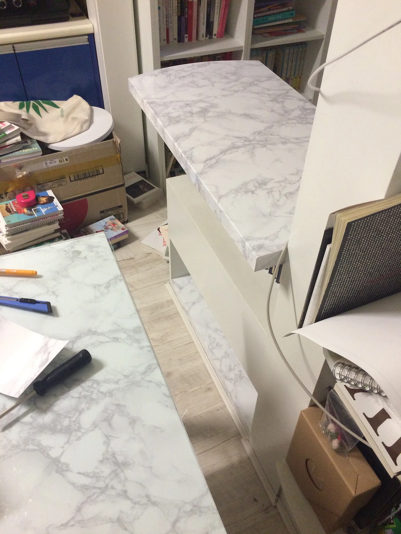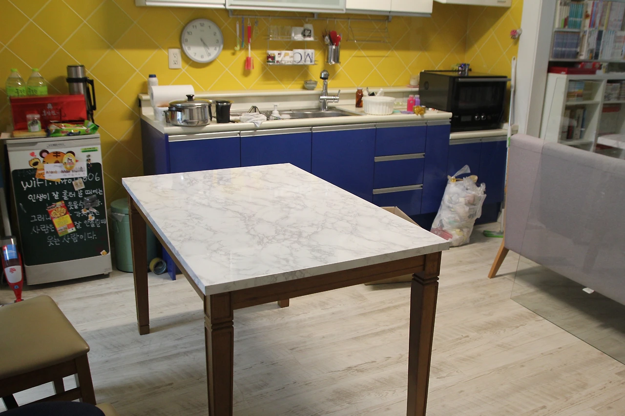 그다음으로 도전한 것은 식탁. 어마어마하게 큰 데다가 조금만 어긋나도 다 비틀어진다. 30분 동안 붙였나. 식탁 붙이면서 제일 비속어가 많이 나왔던 것 같다. 기포도 엄청 잘 생기고 기포 때문에 다시 떼어내는데 늘어나는 바람에 결국 세제물을 뿌려가며 작업했다. 그래도 제일 뿌듯한 작업물이었다. 남동생이 집에 와서 식탁을 새로 산 줄 알았다며 호들갑을 떨어주는데 어찌나 기쁘던지. 그래도 시트지는 열에 약하니까 원래 있던 유리를 다시 덮어주었다. 어딘가 성스러워 보이고 비싸 보이는 대리석 시트지 효과는 유리를 위에 올리면 반감된다. 그렇다고 뜨거운 걸 막막 올려야 하는 식탁에 시트지만 붙인 채로 사용하긴 또 두려우니까 유리를 살포시 덮어주는 걸로.