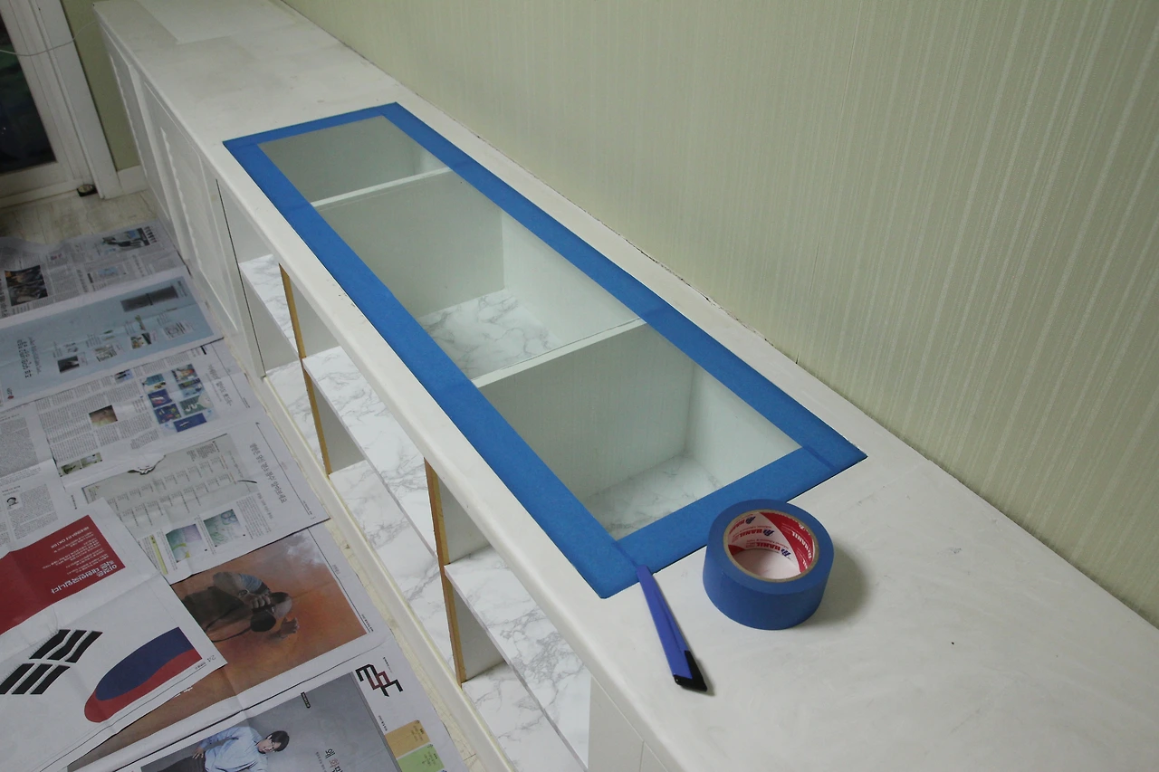 *시트지 뒤쪽에 모눈종이처럼 눈금 표시가 있으니 참고해서 자르면 된다. 미리 선을 그려두면 좋다.