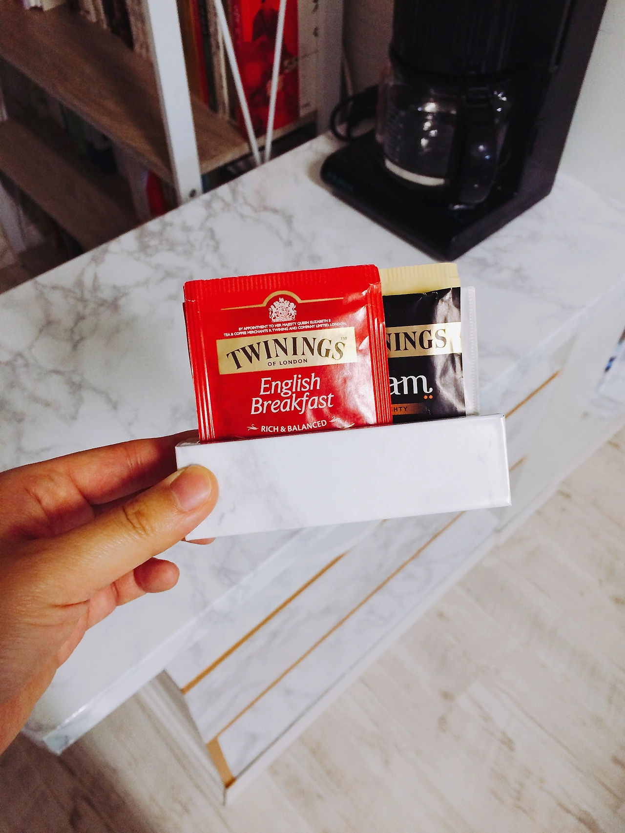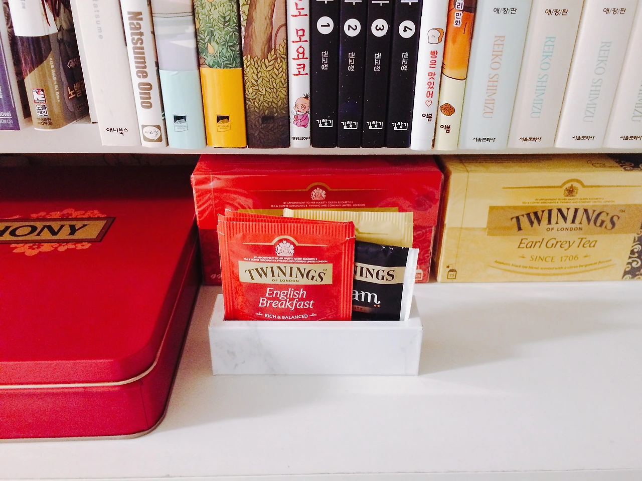 남은 대리석 시트지는 명함꽂이에 붙여서 티백 꽂이로 바꿔봤다. 대리석 테이블이랑 세트인 것 같아서 예쁘다.