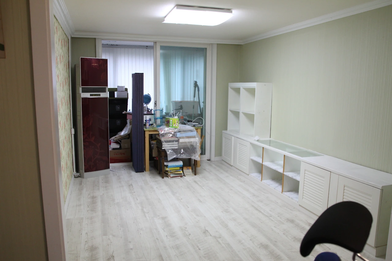 녹색이 잘 어울리는 벽 탄생. 어떻게 보면 갤러리 같고, 어떻게 보면 교실 같다.