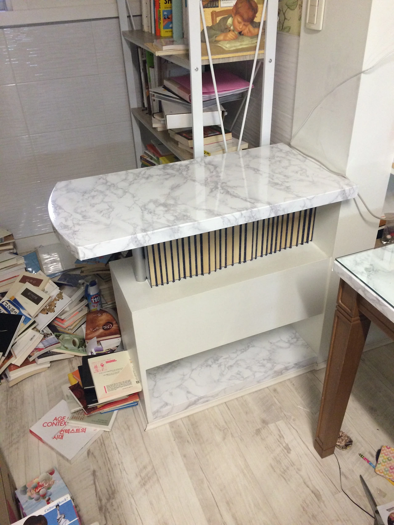 곡선에서 내게 좌절을 맛 보여준 아일랜드 식탁. 쉬울 줄 알았는데 오산이었다. 하지만 제일 결과물이 있어 보이니까 참는 것으로... 밋밋해 보일까 봐 금색 테두리를 둘러줬는데 포인트로 딱 예쁘다. 전개도를 반대로 생각해서 잘못 자르는 바람에 울면서 시트지를 다시 시킬까 고민하게 만들었던 아일랜드 테이블이다. (흑)