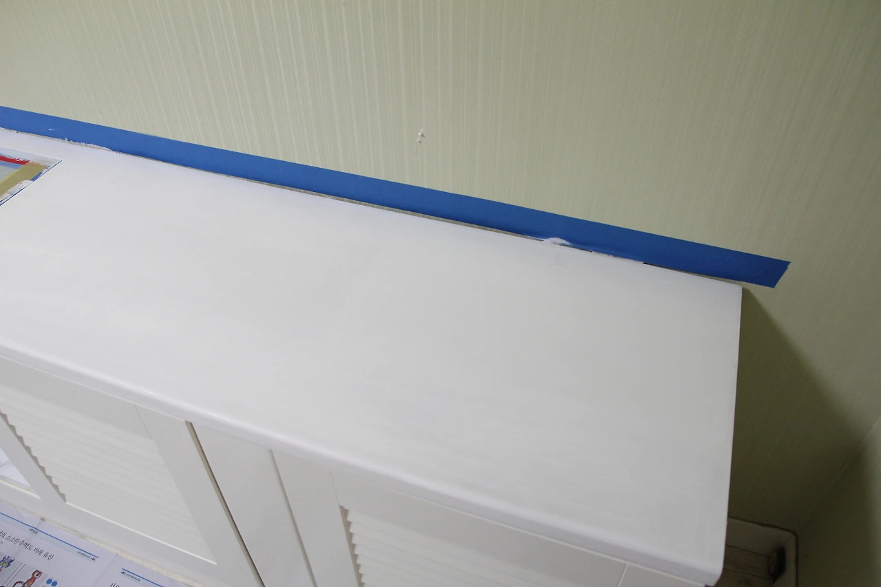 페인트가 튈 수도 있는 부분에 커버링과 마스킹 테이프를 이용해 덮어준다. 아래 문까지 다 칠할까 하다가 귀찮아서 위에만 다시 칠하기로 했다. 보면 먼지가 쌓였던 부분과 아닌 부분의 색이 확 차이가 난다.