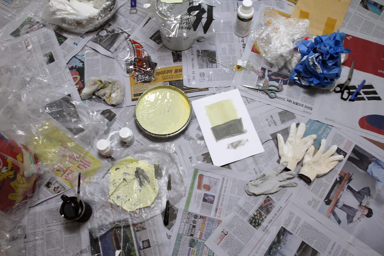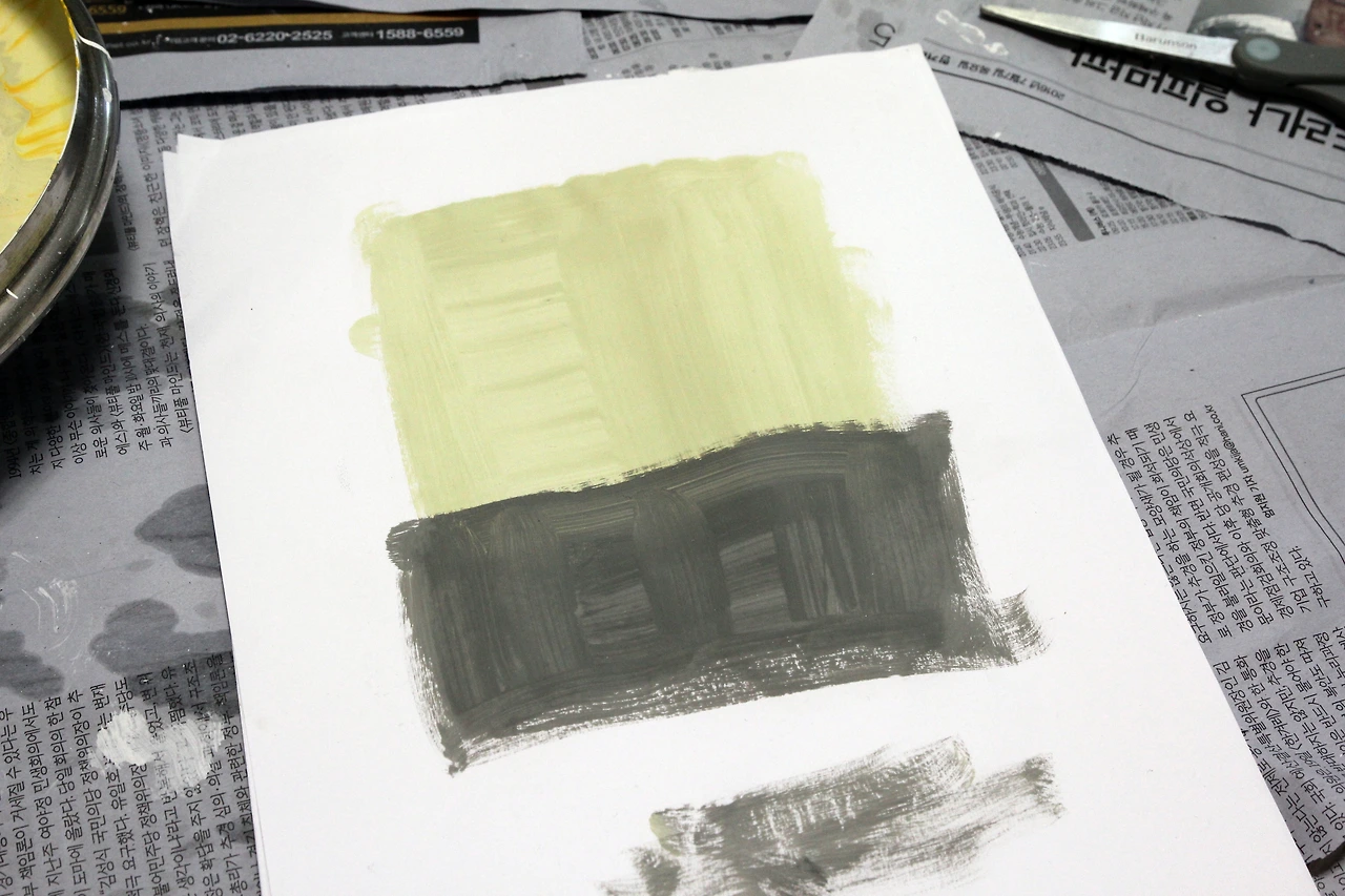 그래서 어차피 바탕이 하얀색 페인트이니까, 노란색을 섞어도 연노랑이 될 테고 거기에 블랙 잉크를 섞으면 카키에 가까운 노란색이 나올 것 같았다. 그래서 생각난 김에 자다가 일어나 조색 테스트를 시작했다. 생각대로 차분한 탁한 노란색은 오묘한 빛이어서 마음에 들었고 그 아래에 그레이로 마무리하면 괜찮을 것 같았다.