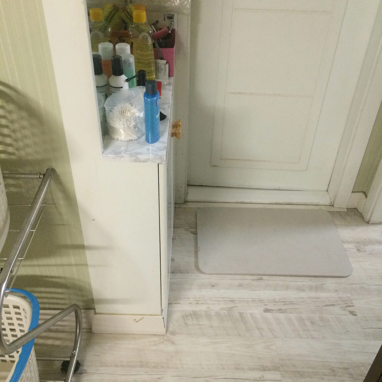 특히 이 화장실 앞 미니 화장대는 헤어 무스나 바디 오일 등이 떨어질 일이 많은데도 목재인 데다가, 그 위에 바니쉬가 발라져 조금만 신경을 쓰지 않으면 먼지가 수북이 쌓이곤 했다. 그래서 대리석 시트지로 깔끔하게 발라주고 금색으로 포인트를 주었더니 훨씬 깔끔해졌다. 역시 금색 아크릴 물감으로 포인트를 줬는데 이걸 보고 남동생이 누나는 로마. 그리스 풍을 좋아하는 것 같다며, 그 시대의 목욕탕이 생각난다고 놀렸다. (끙)
