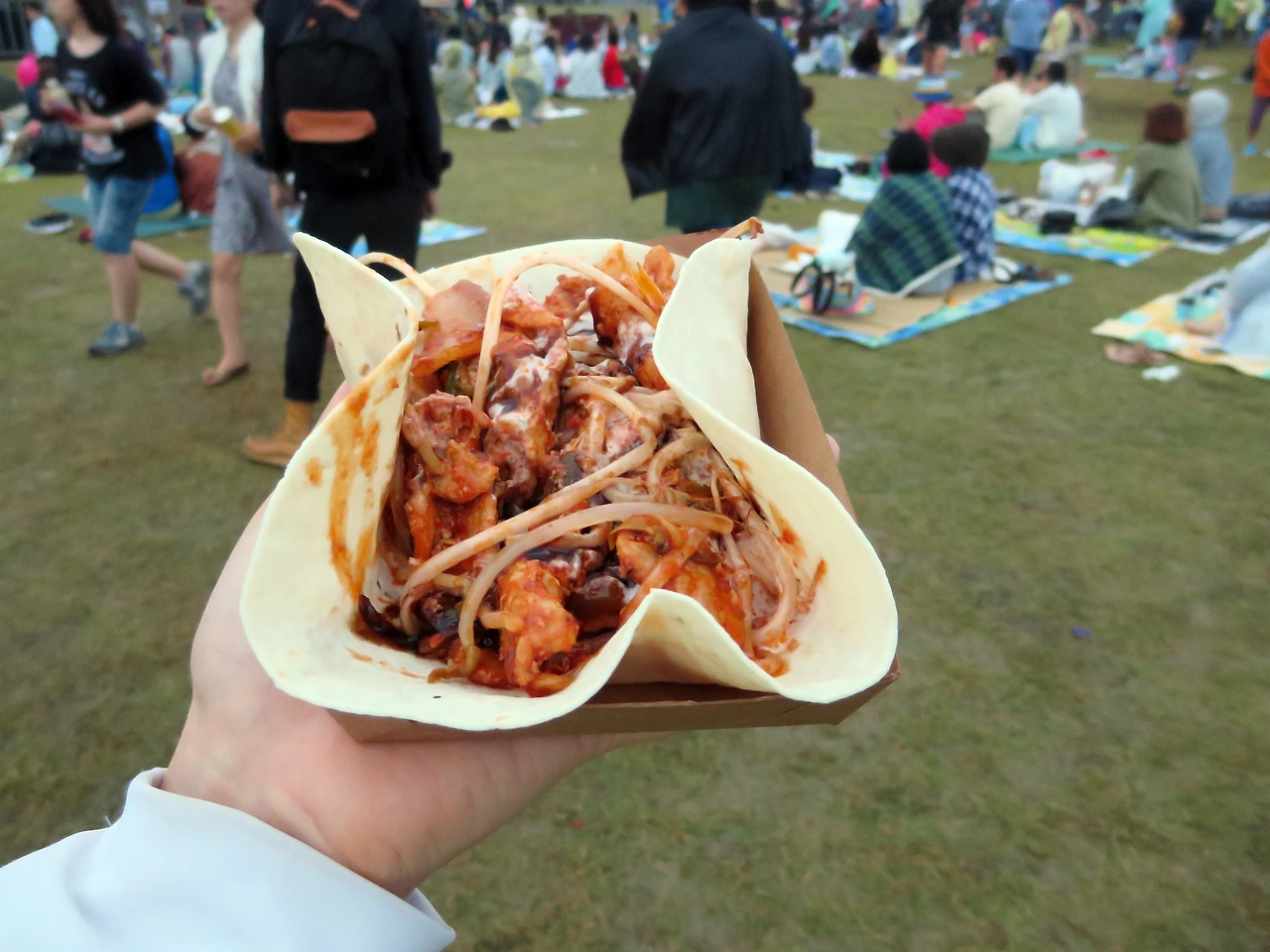 1시간정도 메인 무대의 공연이 장비 셋팅으로 한참 분주할 때, 좌석의 앞뒤에서 풍겨오는 치킨 냄새가 환상적이었다. 결국 혼자 부산에서 오셨다는 옆 사람과 함께 자리를 털고 일어나서 치킨을 먹으러 갔는데 흑돼지 매콤 불고기 타코가 눈에 들어오는 바람에 메뉴 변경, 긴 줄을 기다리는 동안 전제덕의 하모니카 소리에 마음이 평화로워졌다.
