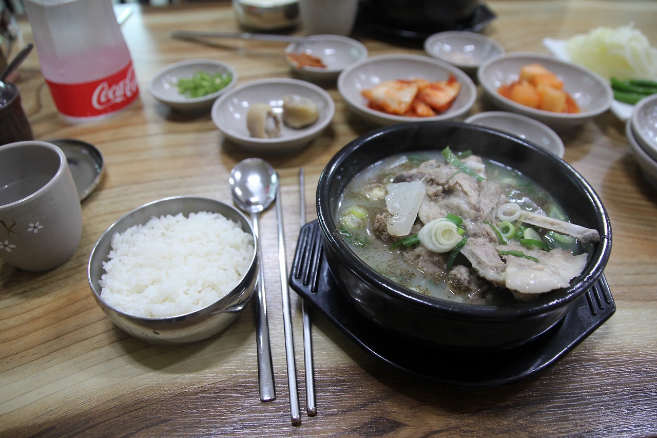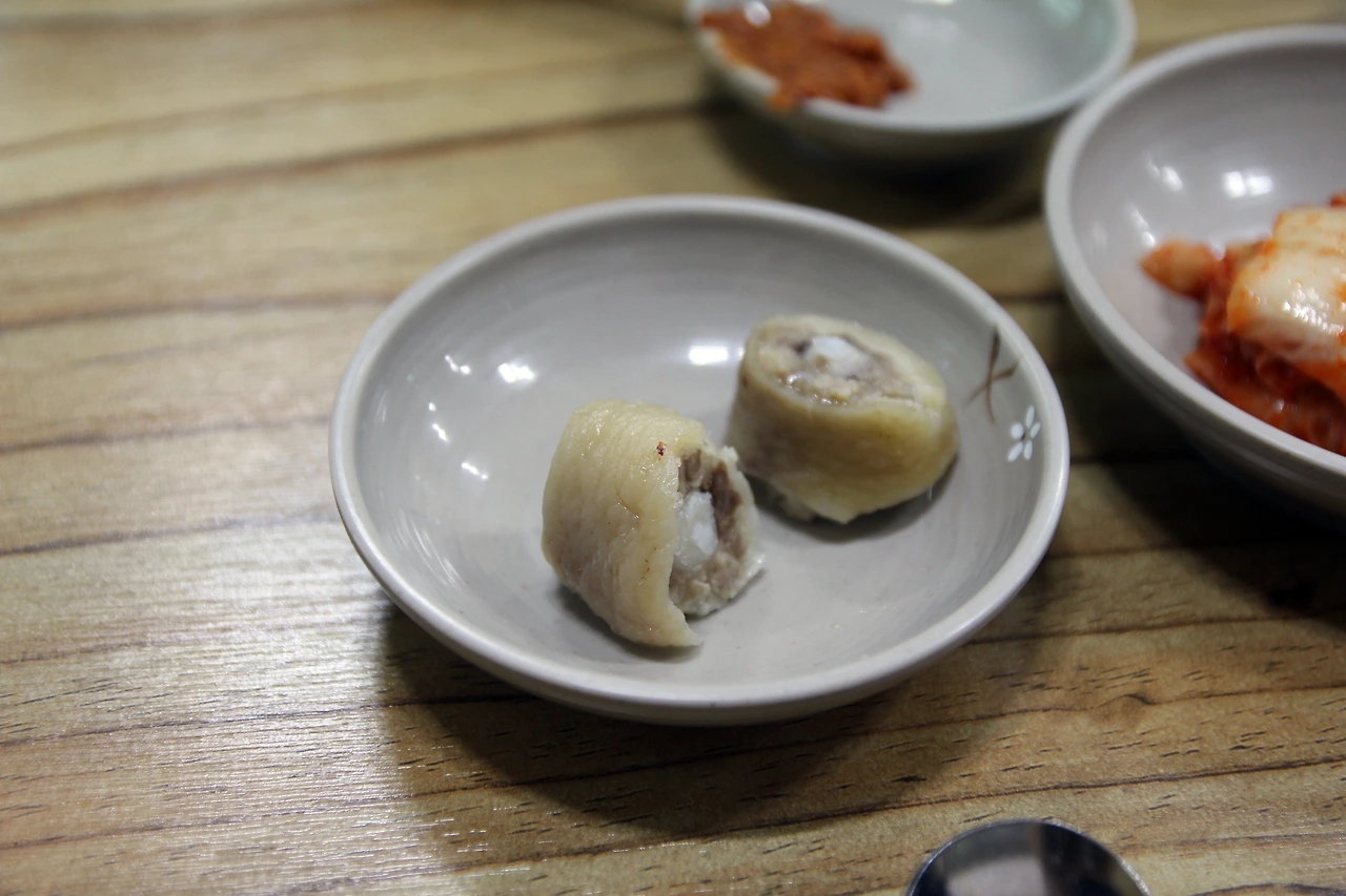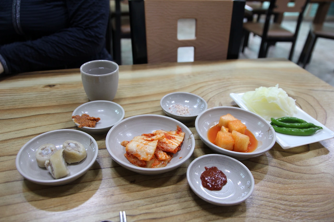 식당에 도착하자 어머니와 아들로 보이는 모자가 열심히 일하고 있었다. 제주도 장례식 때 먹는다는 고사리육개장과 잔치 때 먹는 음식이었다는 접짝뼈놈삐국을 주문했다. 반찬이 나왔는데 원래 나오던 간이 오늘은 없어서 돼지 꼬리뼈를 삶은 것을 주셨다. 젤라틴 덩어리가 탄력 있게 씹히는 것이 독특했다.