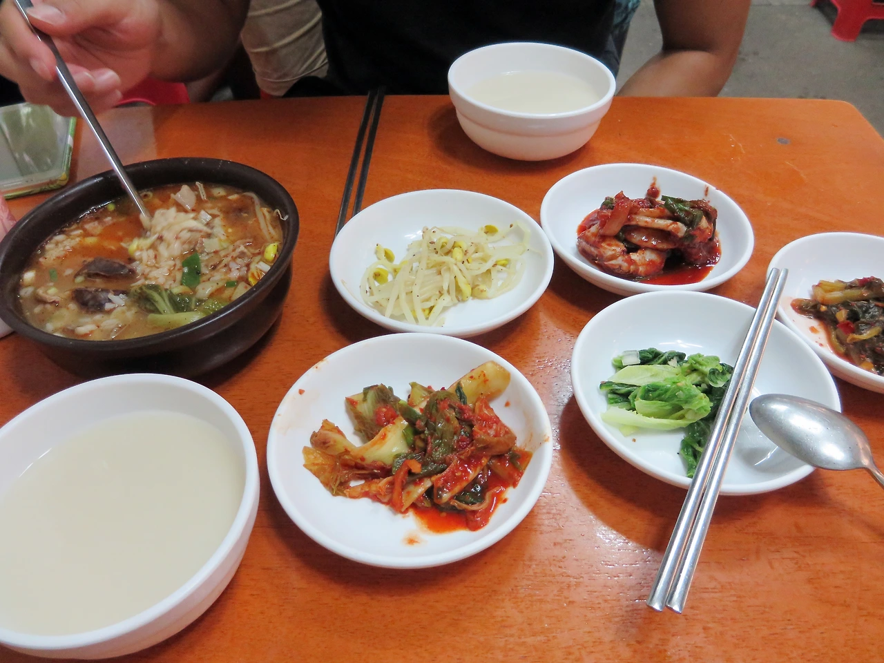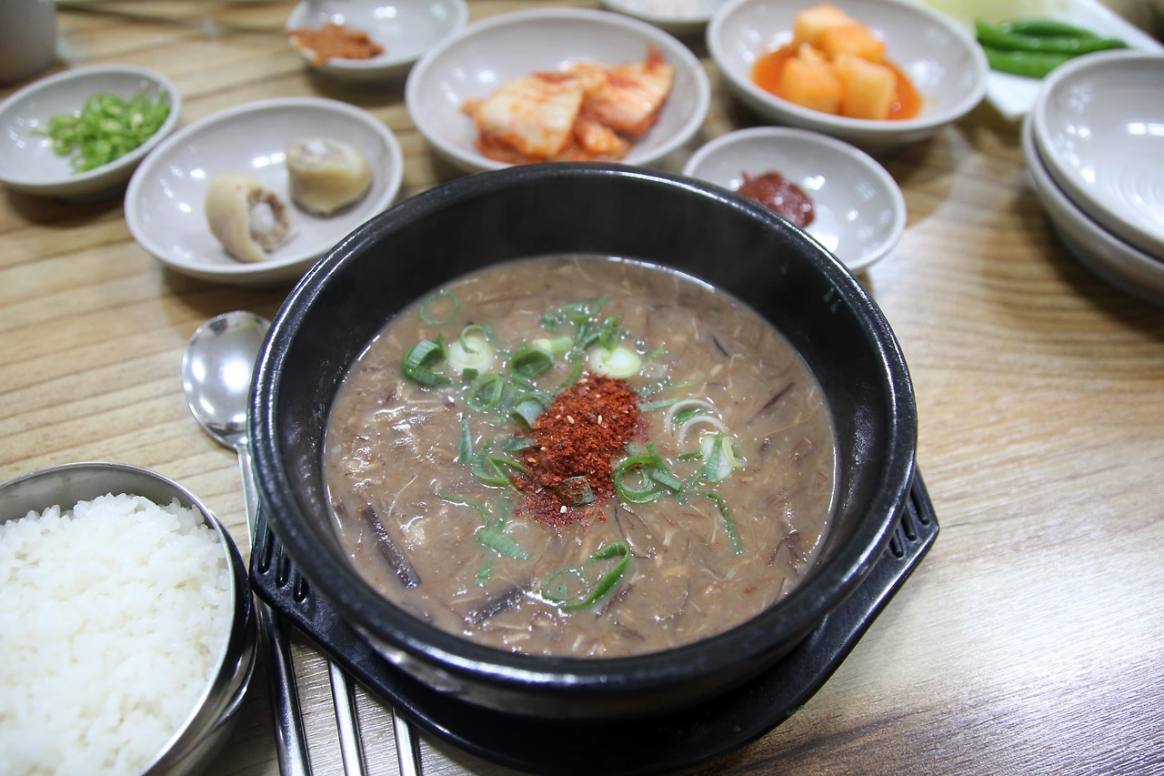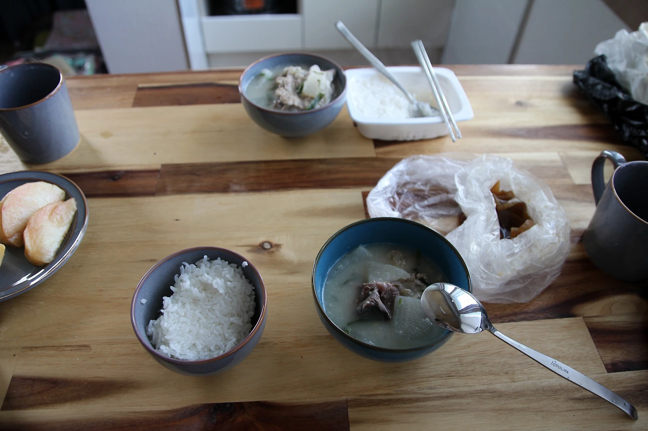 식당에 도착하자 어머니와 아들로 보이는 모자가 열심히 일하고 있었다. 제주도 장례식 때 먹는다는 고사리육개장과 잔치 때 먹는 음식이었다는 접짝뼈놈삐국을 주문했다. 반찬이 나왔는데 원래 나오던 간이 오늘은 없어서 돼지 꼬리뼈를 삶은 것을 주셨다. 젤라틴 덩어리가 탄력 있게 씹히는 것이 독특했다.