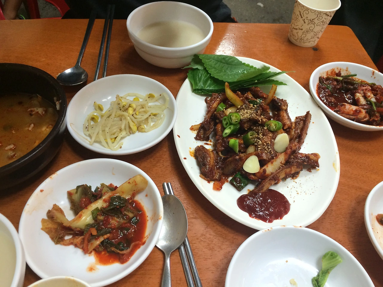 뭐 달리 방도가 없지. 금주 중이라는 사장님의 결심이 무색하게 막걸리를 한병 시키는 수밖에, 반찬도 깔끔해서 국밥이 아니더라도 안주는 많았다. 물론 이건 꼼장어가 나오기 전까지의 이야기였다.