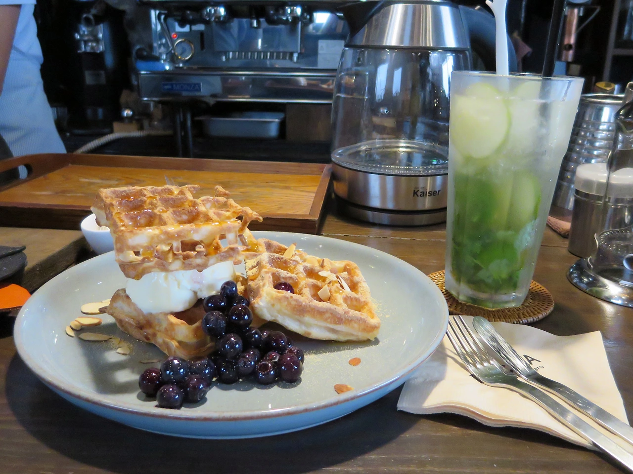 딱 봐도 싱글 와플의 양이 꽤 되어서 우스갯소리처럼 와플을 사실 더블을 시키려다 말았어요 하니 음식이 남는 걸 싫어하셔서 더블을 시켰어도 안 주셨을 거란다. 이런 소신 있는 주인장 좋다. 찹쌀 와플은 바삭하니 쫄깃해서 차가운 바닐라 아이스크림과 쫀득하니 잘 어울렸다. 너무 달다 싶으면 새콤한 블루베리를 몇 알 씹으면 된다. 모찌 와플을 좋아한다면 꼭 먹어보면 좋겠다. 쫀득쫀득한 와플이 꼭 구운 떡 같기도 하고 바삭하게 쿠키 같기도 하다. 아침을 먹지 않고 왔는데도 혼자 다 먹으려니 배가 불렀다.