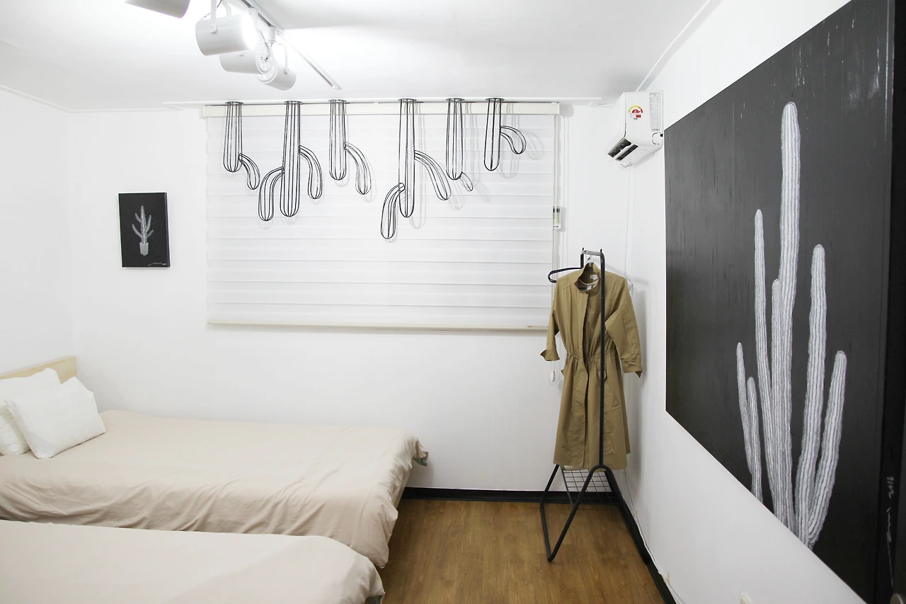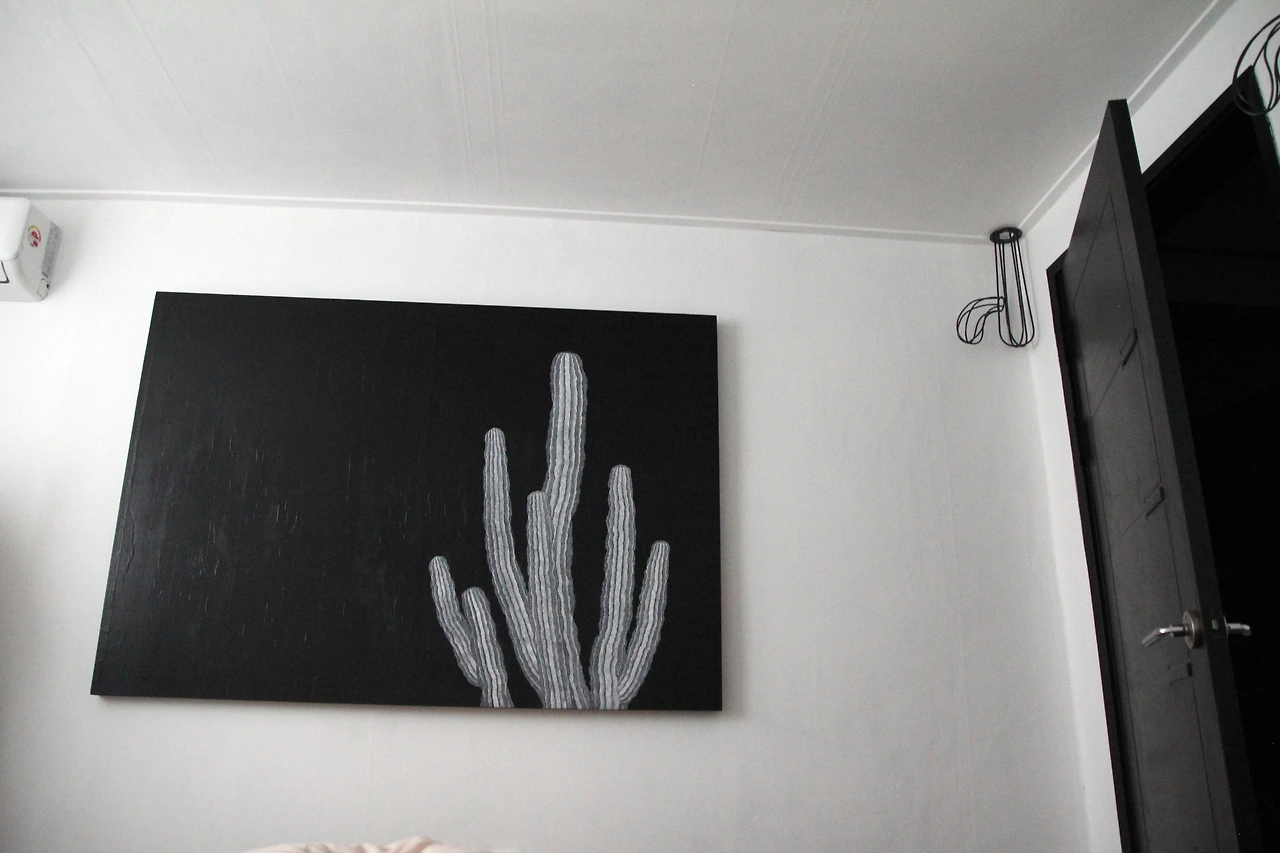 호스트 우성님이 떠나고 도착이 늦어지는 친구를 기다렸다. 조용한 방 안에서 바라본 하얀 벽에 걸린 까만 배경의 하얀 선인장들은 '어둠 속의 대화'에 들어간 나 같았다. 그렇게 생각하니 까만 배경 위에 그려진 하얀색의 선인장들은 마치 살아있음을 증명하는 반딫불빛처럼 보였다.