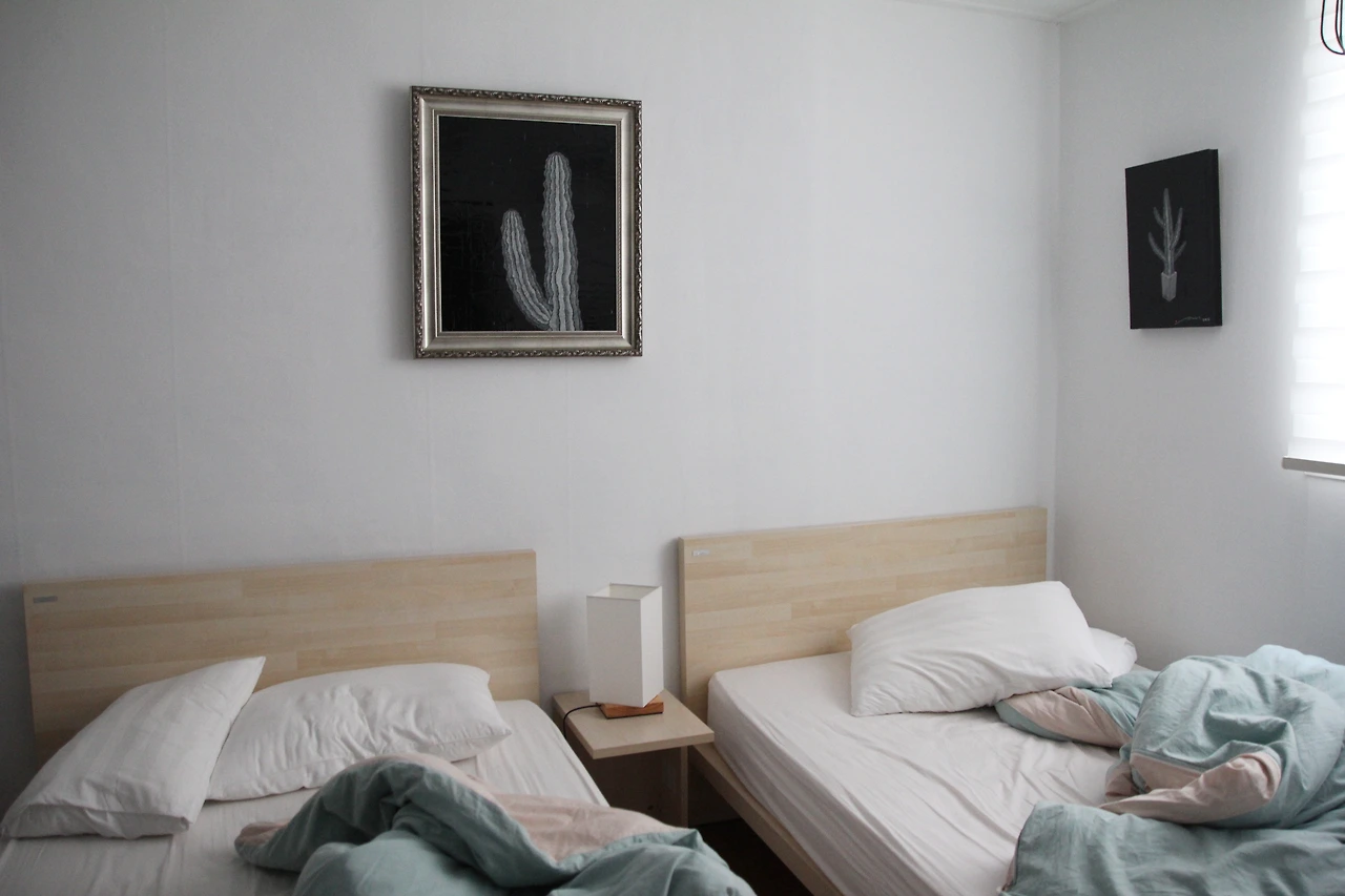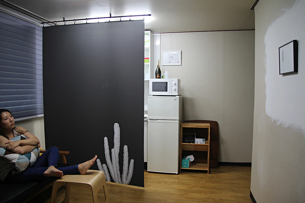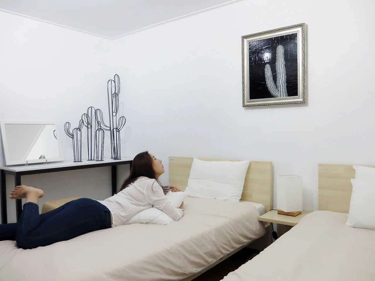 숙소에서 편한 옷으로 갈아입고 먹은 갓 튀긴 파닭은 맛있었다. 편하게 소파에 앉아 파닭을 먹는 동안 친구는 '이 숙소에 TV가 없네.' 하고 아쉬워했다. 소파 맞은편에는 김민기 작가의 초기작이 걸려 있었기에 TV를 보는 대신 우리 둘은 몸을 틀어 서로를 마주하고 소소한 이야기를 나눴다. 나는 예술을 좋아하고, 예술을 경험하는 일에 워낙 오픈 마인드이기에 일반적인 직장인에 가까운 친구의 숙소에 대한 소감이 궁금했다. 친구는 작가가 직접 그리고 만든 작품들이 숙소에 설치되어 있다는 점과 그 숙소가 바로 주택가의 어느 빌라의 한 집이라는 사실이 특별하게 느껴진다고 했다. 페이크 작품과 진짜 작품이 가지는 무게감이 다른 것 같다면서 숙소에서 지내는 동안 작품들을 훼손할까 봐 조금 두렵기도 하다고 했다. 그래서인지 숙소에 지내는 동안 친구는 작품과의 안전거리를 확보하는 것에 심혈을 기울이는 것 같았다. 나는 작품이 어렵다거나 훼손할까 봐 두렵단 생각은 거의 들지 않아서 오히려 그런 의견이 신선하게 느껴졌다. 친구는 벽에 걸린 그림들보다 화장대 테이블과 창문과 방 곳곳에 설치된 선인장 조형물이 인테리어 소품 같아 훨씬 예쁘고 편하다고 했다.
