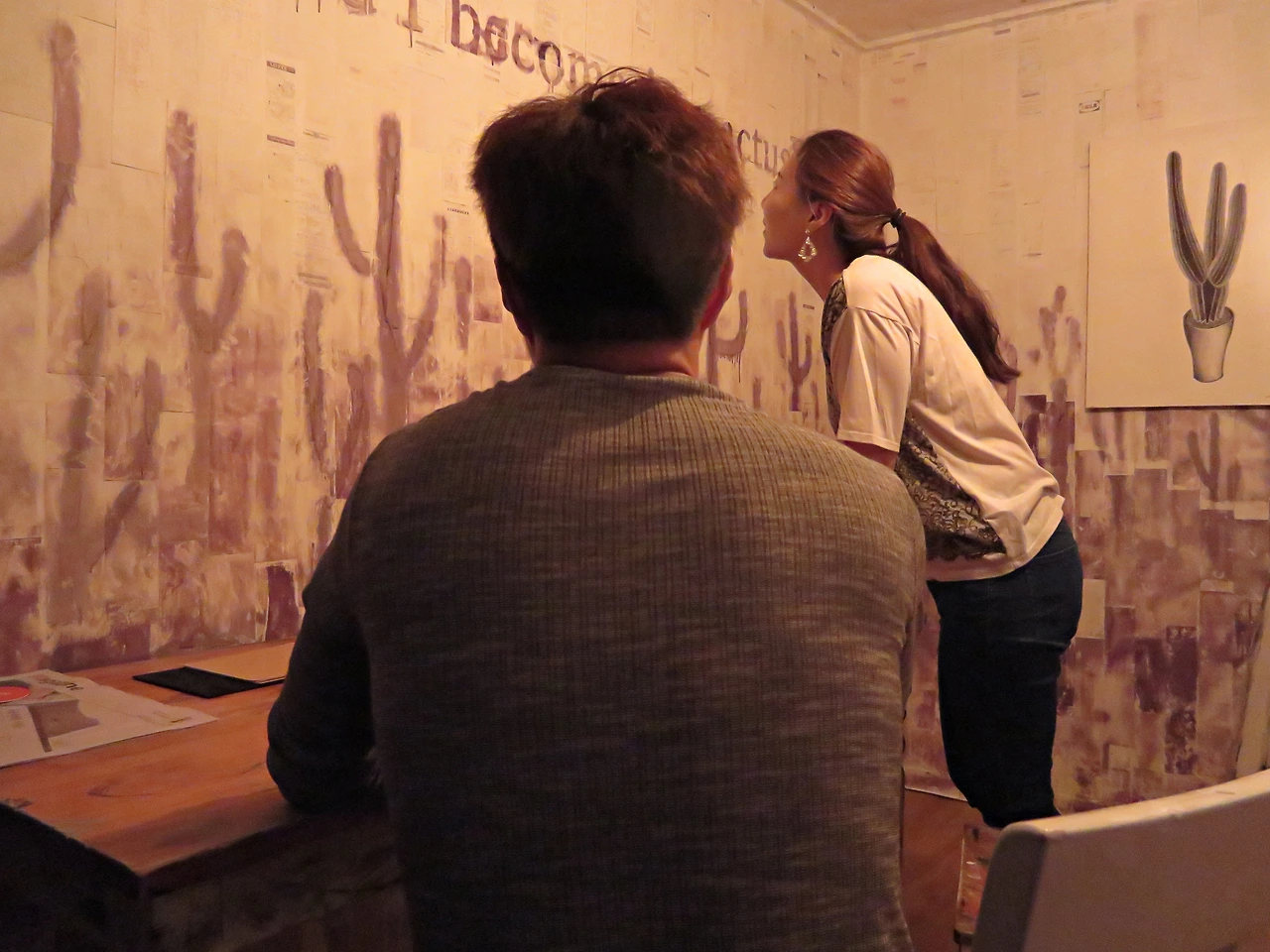 우앤우에 설치된 작품들은 모두 조각가 김민기 작가의 작품들로 김민기 작가의 작품들 중 선인장 형상을 띈 작품들만으로 구성되어 있었다. 선인장처럼 보이는 그림자들로 둘러싸인 방은 김민기 작가가 사용한 영수증을 모아 전면을 도배하고 그 위에 새롭게 이미지를 덮은 독특한 공간이었다. 책상의 한 쪽에는 영수증을 기증받는 빈 페인트 통이 있었는데, 이 숙소에 머무는 사람들이 그 통에 영수증을 넣고 가면 후에 작가의 작품에 사용된다고 한다. 설명을 들으면서, 회사 일과 가정 문제로 이리저리 치이는 친구에게 김민기 작가 작품들이 어떻게 보일지 궁금해졌다.