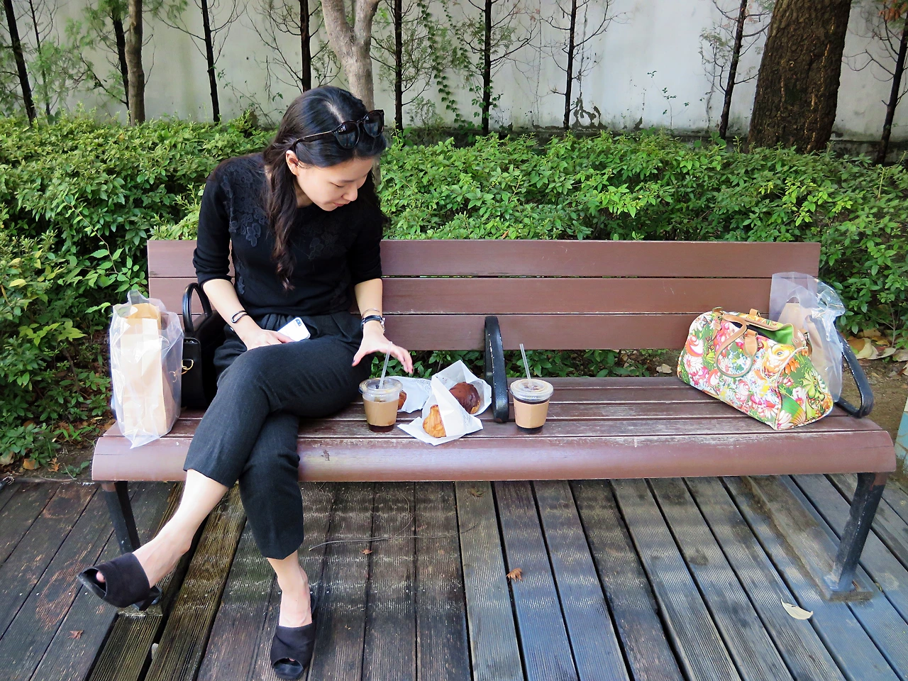 완성된 아이스 아메리카노 두 잔을 들고 앉아서 먹을만한 장소를 찾아 연트럴 파크로 발길을 옮겼다.
