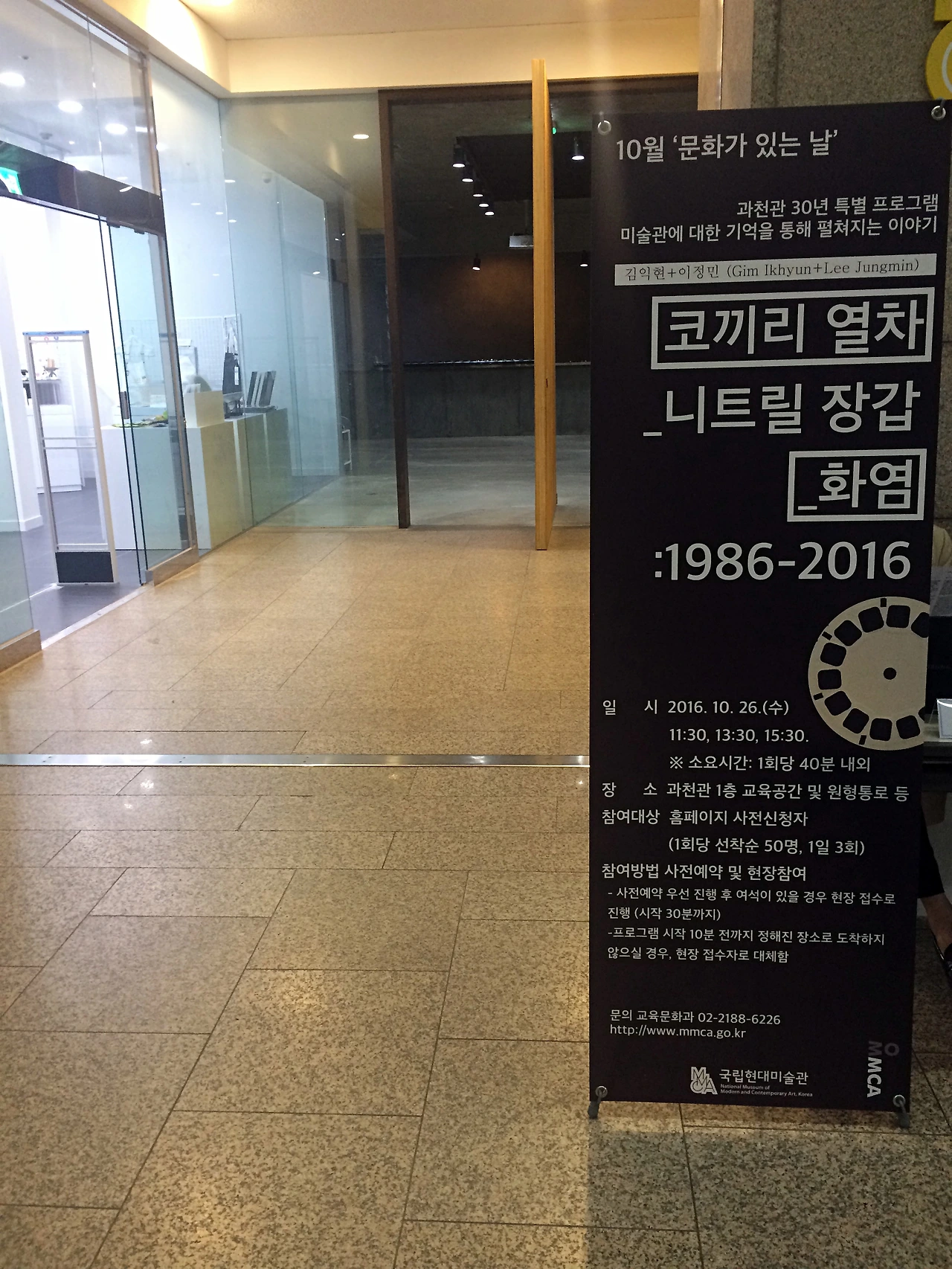 10월 문화가 있는 날 과천 현대 미술관에서는 '코끼리열차, 니트릴 장갑, 화염 : 1986-2016'라는 특별 프로그램이 있었다. 큐레이터 데이를 참석하려고 갔다가 오늘만 이 프로그램에 참여할 수 있다는 사실에 마지막 남은 3시 30분 현장 참여를 예약했다. 사실 저기서 내가 제대로 이해한 부분은 코끼리 열차밖에 없을 것 같다.