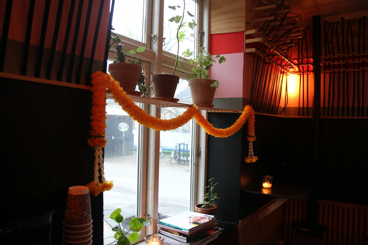 가게 곳곳은 화분들이 놓여 있었고 한쪽 벽면에는 형형색색의 팽이들이 걸려 있었다. 주황색 전등과 곳곳에 놓인 초가 실내를 주황색으로 물들이고 있었다.