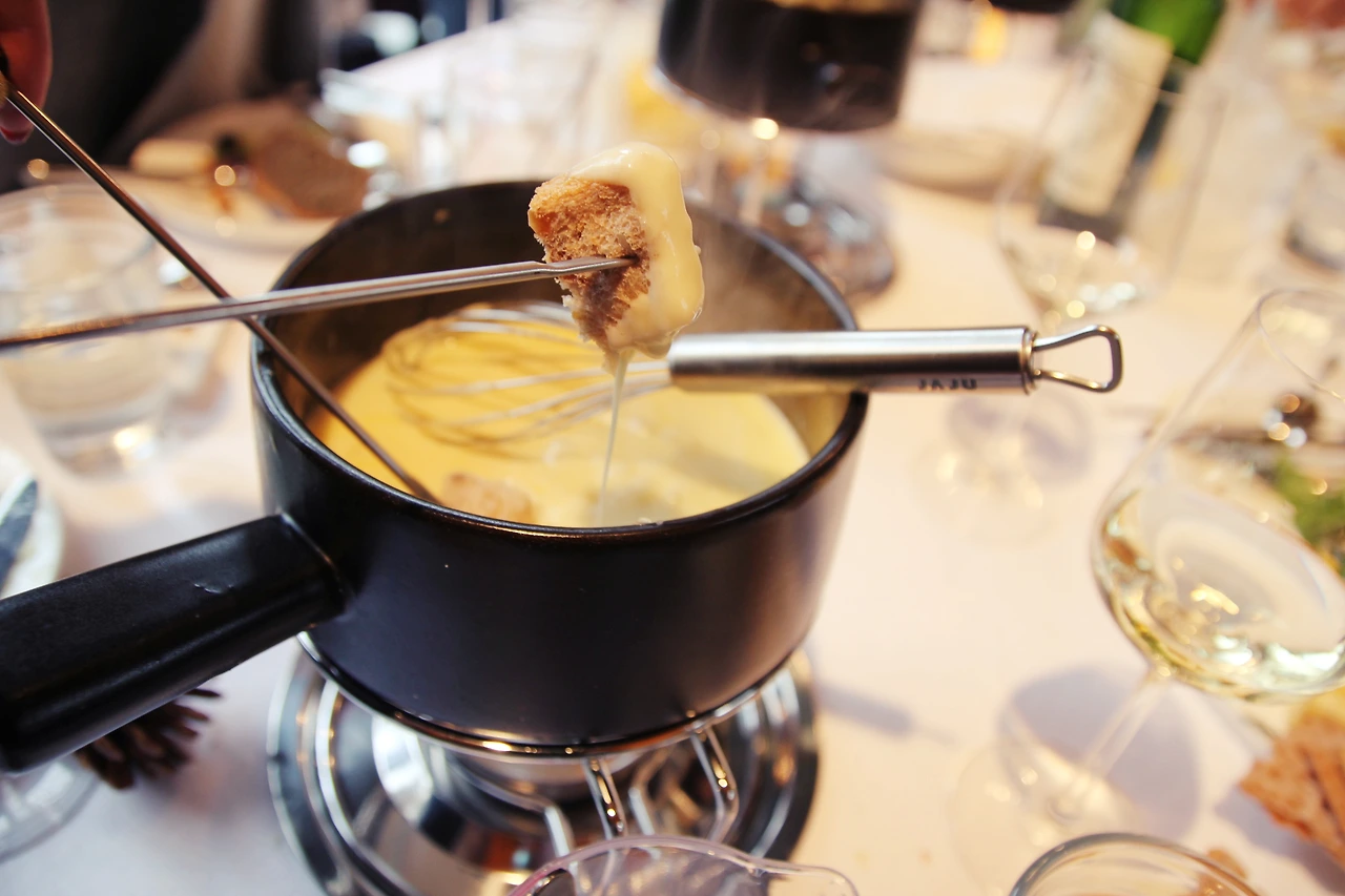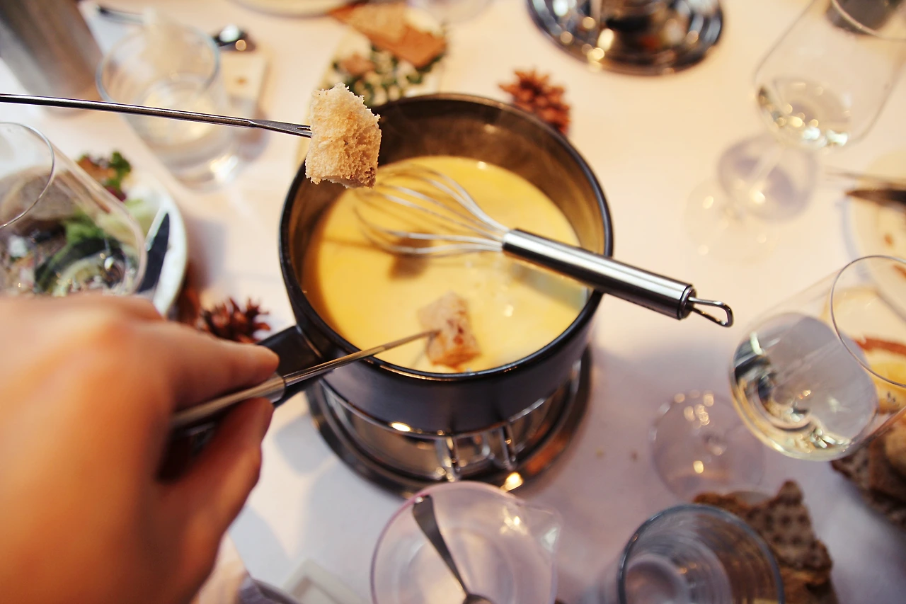 7. 퐁듀 포크에 빵을 찍어 녹은 치즈에 푹 담궈 먹는다.