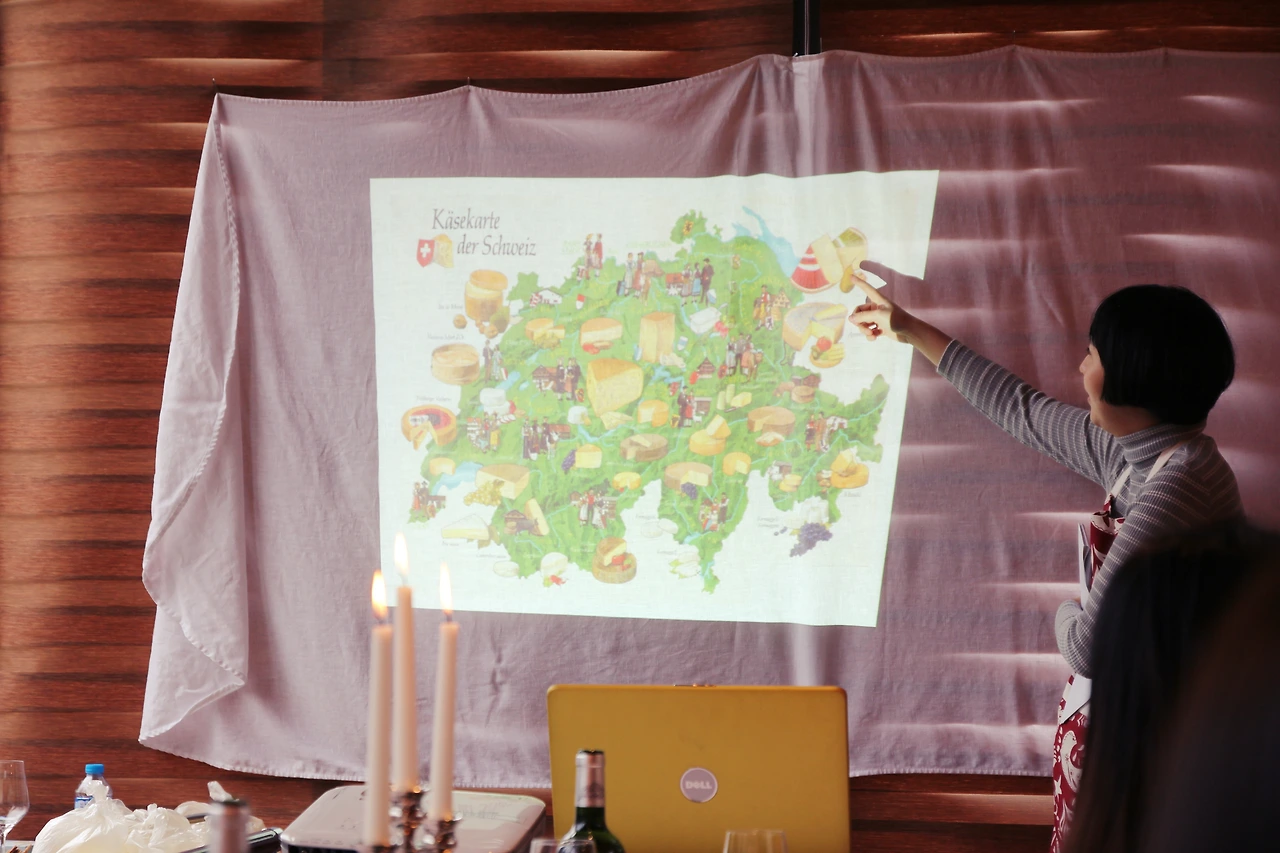 다음은 스위스 각 지역에서는 어떤 치즈가 만들어지는지 배울 수 있었는데 내가 좋아하는 브리 치즈는 스위스의 남쪽에서 우리가 잘 아는 구멍이 슝슝 뚫린 에멘탈 치즈는 스위스의 중앙 지역에서 그리고 동북부 지역에서는 강렬한 향과 맛의 아펜젤러가 만들어지는데, 북쪽 지역으로 갈수록 치즈 퐁듀의 향이 강렬해진다고 한다. 지역마다 김치 맛이 다른 우리나라를 생각해보니 이해하기가 쉬웠다. 스위스의 퐁듀는 우리가 아는 치즈 퐁듀만 있는 것이 아니라 오일 퐁듀, 디저트 퐁듀, 중국 훠궈에서 따온 고기육수 베이스의 퐁듀, 토마토소스와도 비슷한 미국식 느낌의 소스 퐁듀까지 총 다섯 종류가 있다고 한다. 오늘은 덴마크의 알라 치즈를 이용해 스위스 가정식 치즈 퐁듀를 만드는 법을 배울 수 있다고 했다.