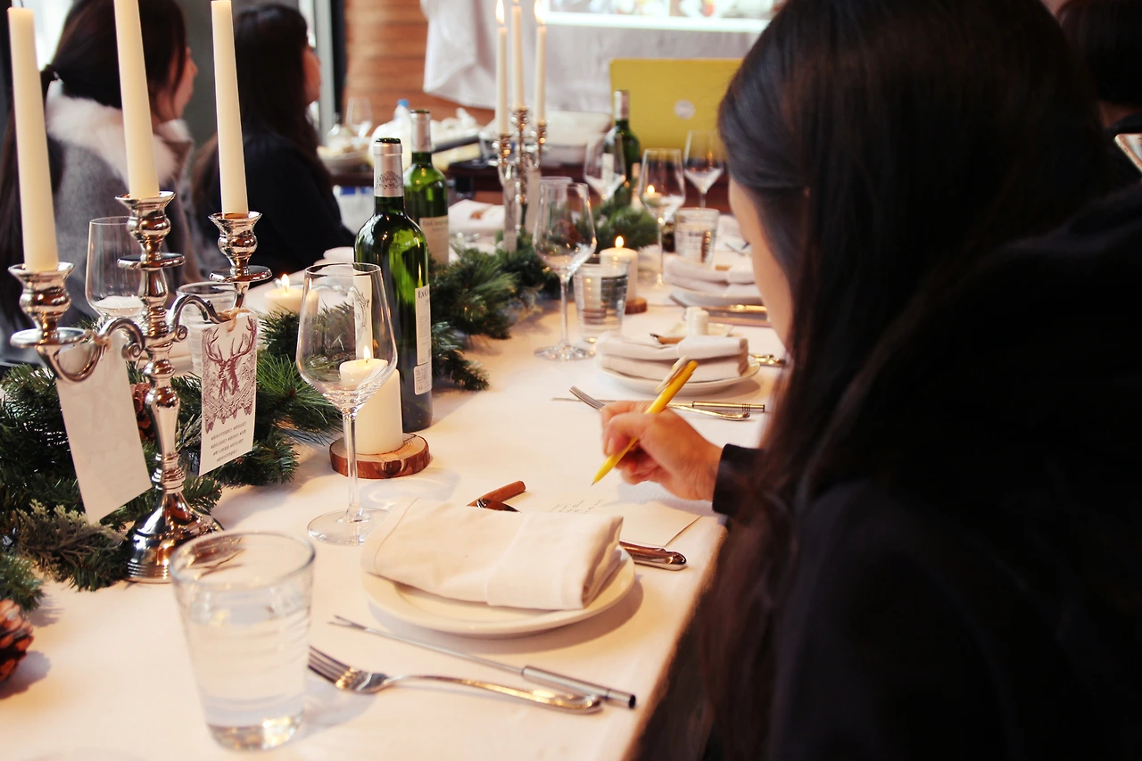 부암동 프렙에 도착해보니, 북유럽 풍으로 꾸며진 테이블 데코레이션을 만날 수 있었다. 쿠킹 클래스를 위해 준비된 VIP 룸에는 코르크 마개가 오픈된 화이트 와인에서 흘러나오는 잔잔한 플로랄 향과 시나몬 스틱에서 느껴지는 겨울의 향, 타오르는 양초의 향들로 가득 차 있었다.