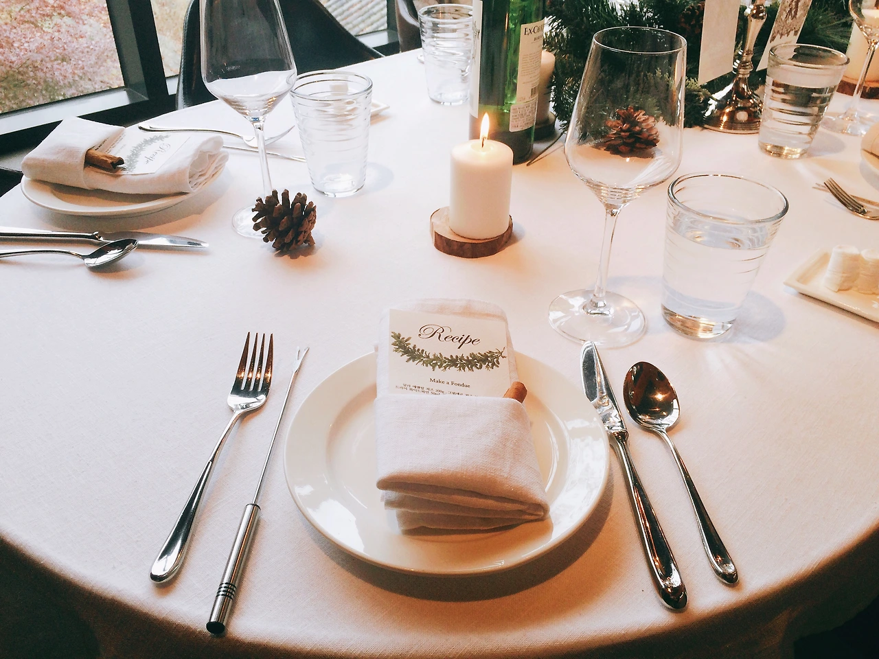 반짝이는 은빛 촛대와 테이블에 굴러다니는 솔방울들, 타닥타닥 타오르는 초와 찰랑거리며 차오르는 따뜻한 물의 훈김이 하얀 테이블보와 네모나게 접힌 린넨과 어우러져 특별한 파티에 초대받은 기분을 느끼게 했다.