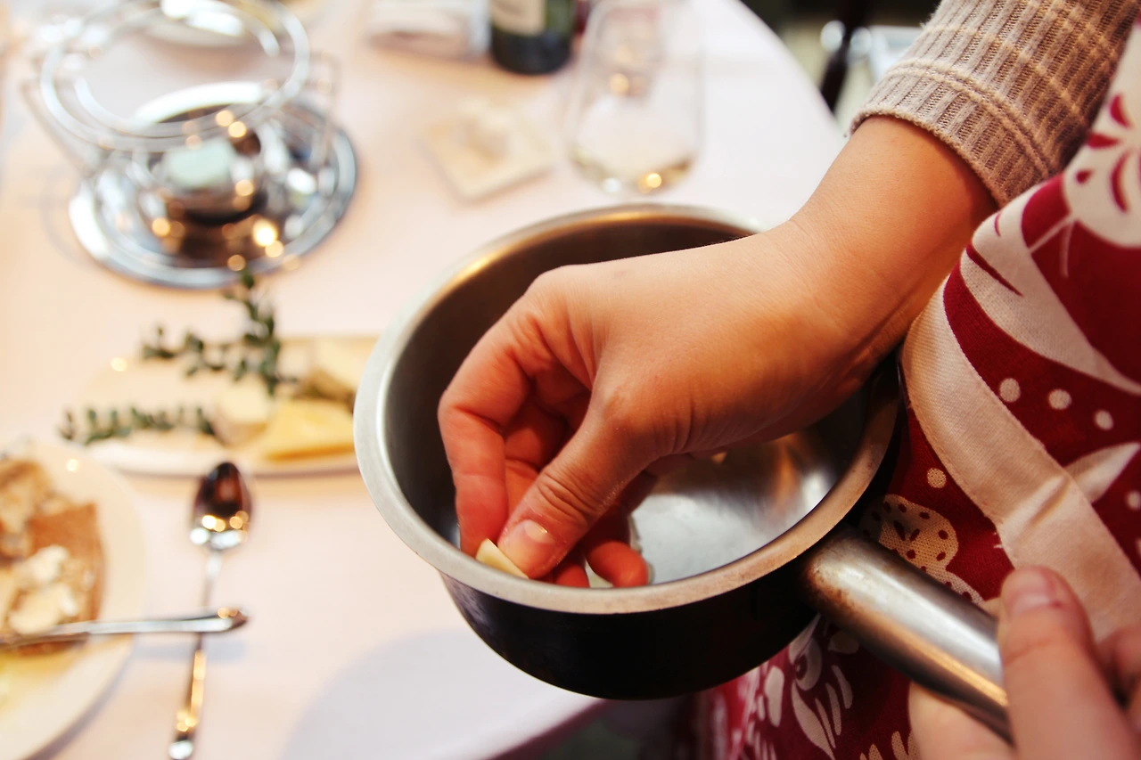 마늘즙에 코팅된 냄비에 마늘을 그대로 둔 상태로 계량한 화이트 와인을 포함한 액체를 부어주고 그 위에 갈아서 섞어둔 알라 에멘탈 치즈와 그뤼에르를 후루룩 넣어준다. 이때 에멘탈 치즈와 그뤼에르 치즈의 비율은 2:1로 넣어주면 된다. (여기서는 200g:100g을 계량해서 넣어주었다.) 만약 치즈를 강판을 갈아놓는 것이 힘들다면 믹서로 후루루룩 갈아버려도 된다. 실제로 스위스의 레스토랑에서는 믹서를 사용해 많은 양의 치즈를 갈아둔다고 한다.