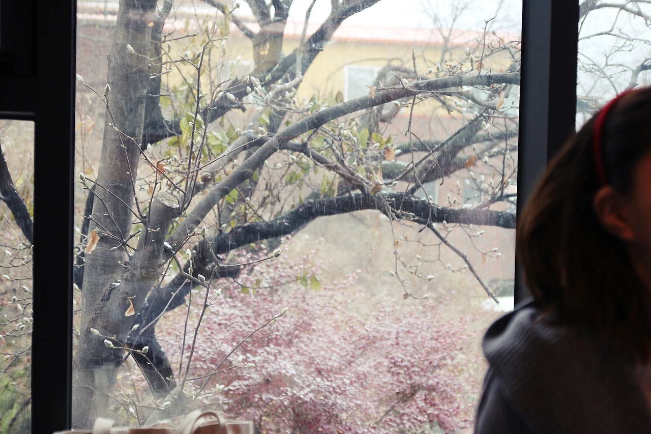 그리고 올해 첫눈이 커다란 창 밖으로 내리기 시작했다. 하얀 눈이 창 밖으로 보이는 나뭇가지와 붉게 물든 단풍에 내려앉기 시작했다.