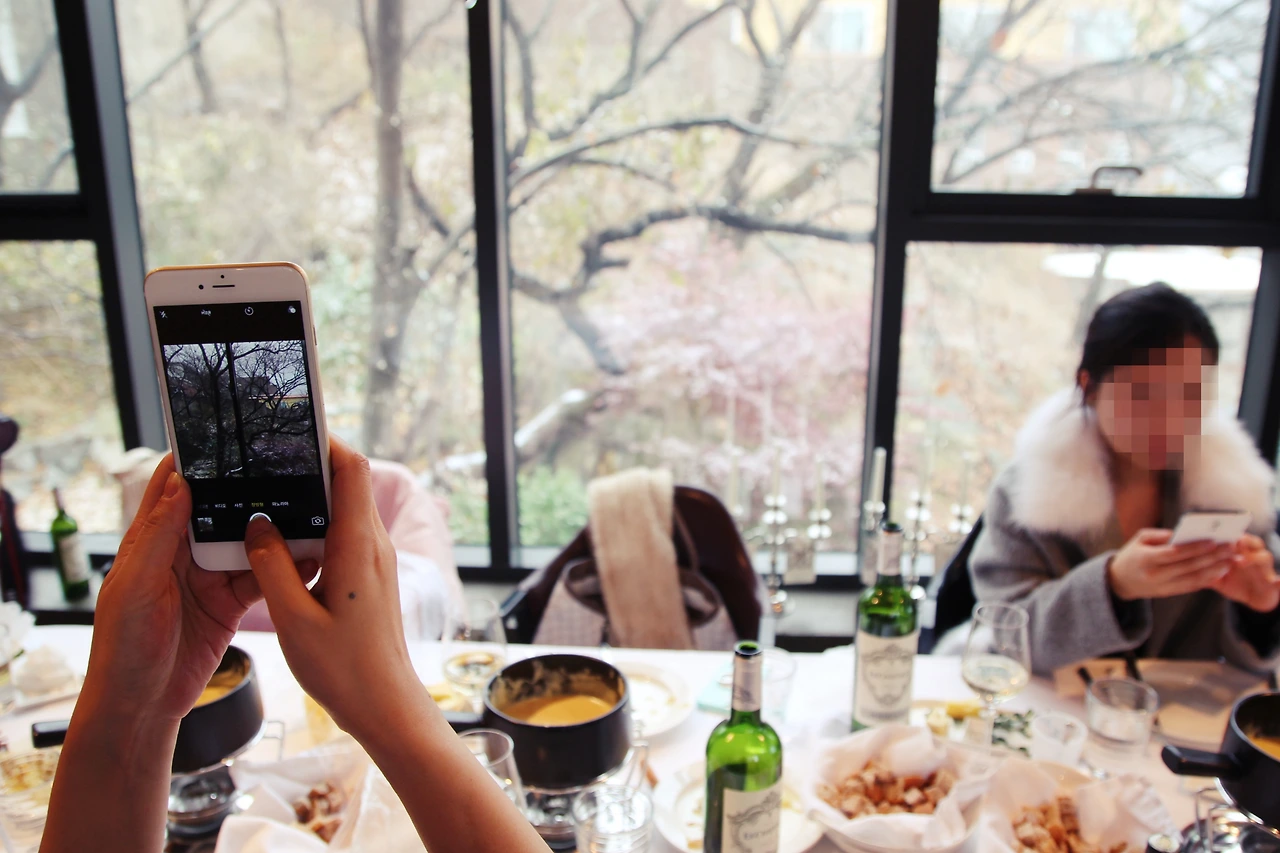 그런데 정말 신기한 게 퐁듀에도 손 맛이라는 것이 있는지 모든 냄비의 맛이 다 달랐다. 그래서 꼬챙이에 호밀빵을 꽂고 다른 퐁듀 냄비로 원정을 떠나기도 했다. 서로의 냄비가 어떤 맛인지 다른 사람들의 퐁듀 맛은 어떤지 와인을 마시며 퐁듀를 먹다 보니 시간이 가는 줄을 몰랐다. 게다가 그 사이에 창 밖에는 하얀 눈이 쌓여서 절경이었다. 신선놀음이 따로 없었다. 사람들은 아름답게 날리는 첫눈을 바라보며 오늘 타이밍이 정말 환상적이라며 열심히 사진을 찍었다. 하얗게 날리는 눈 덕분에 스위스로 여행온 것 같은 기분을 느낄 수 있었다.