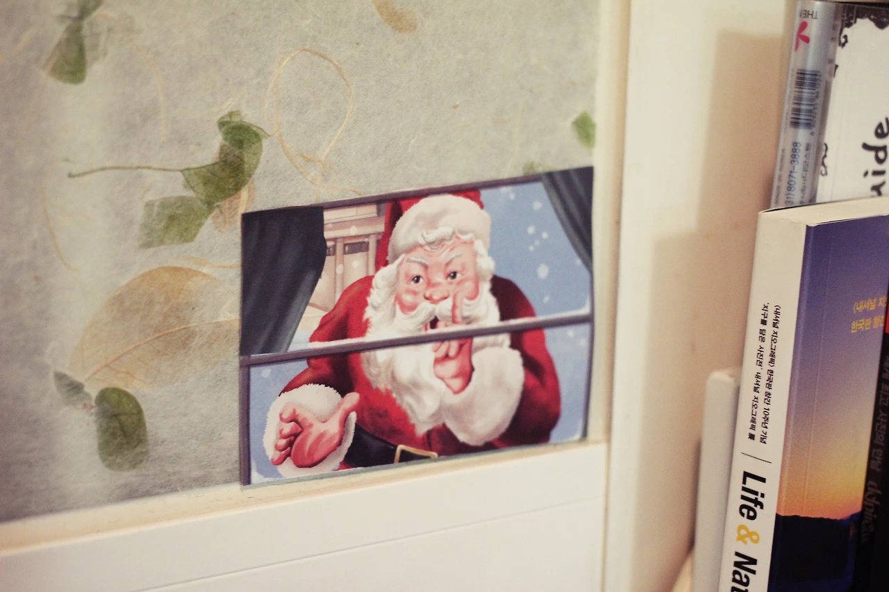 크리스마스가 왔다. 우리 집은 그래 봤자 트리도 없고 전구도 없고 로망조차 없건만 올해는 다르다. 집 정리도 끝난 참이고 손님들도 오고 하여간 그래서 열심히 대청소를 했는데 잠시 쉬며 데굴데굴 굴러다니는 동안 남동생이 나를 방 밖으로 불러낸다. 뭔가 했더니 현대백화점에서 온 크리스마스 전단지의 일러스트를 오려내어 집 이곳저곳에 산타를 숨겨둔 것 아닌가. 크리스마스 데코레이션이 딱히 없던 이 집에 그렇게 작은 산타들이 숨어 있다 생각하니 재미있고 신이 나서 더 해보라고 부추겼다.