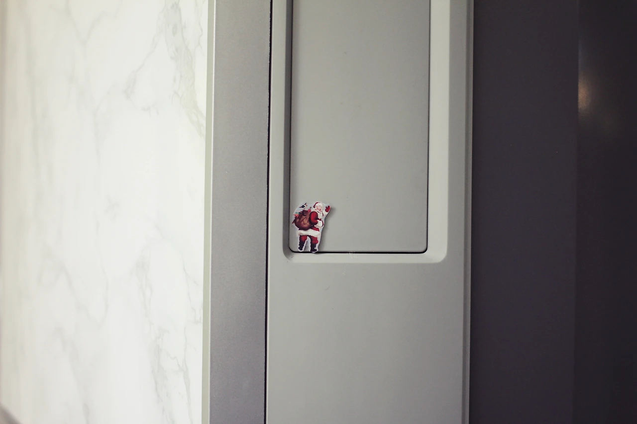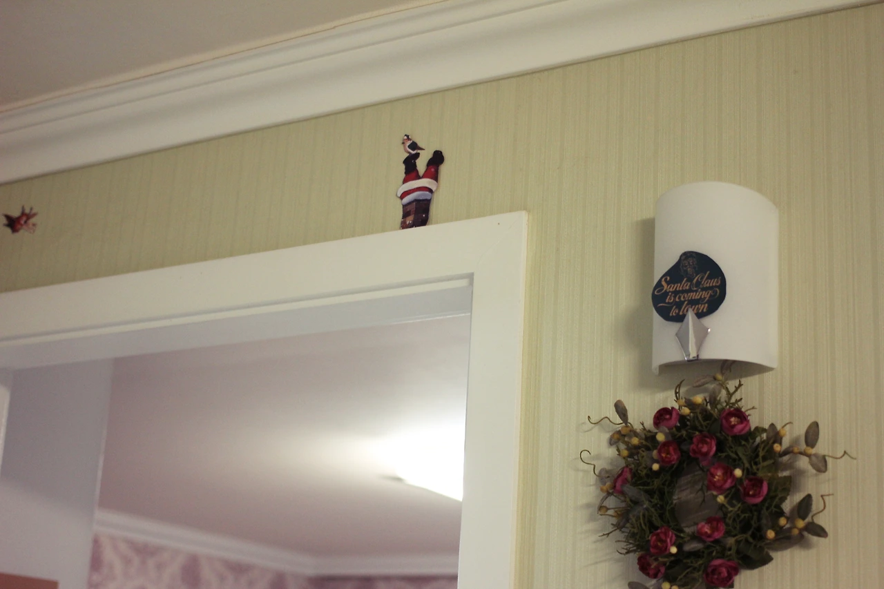 빈티지한 리스 아래에는 뽀송뽀송한 산타 인형과 눈사람 인형이 매달려 있다. 전등 스위치 위에는 선물을 이고 가는 산타(찾았다!)가 있었다. 요건 못 찾을 수가 없지!