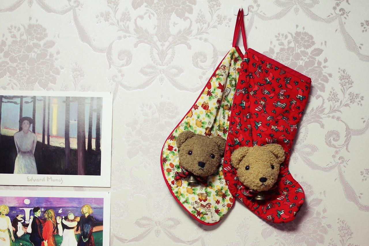 마찬가지로 초등학생 때 받았던 곰인형 양말도 벽에 걸어두었다. 이제는 엄마가 사탕이나 선물을 채워주시진 않겠지만 어릴 때는 이 양말이 너무 커서 작은 트리에 매달 수 없는 것이 속상할 때도 있었다. 지금은 내 돈으로 사탕도 과자도 케이크도 사 먹을 수 있는 나이가 되었지만 여전히 크리스마스 양말을 보면 안에 사탕이 있을까 손을 넣어보고 싶어 진다.