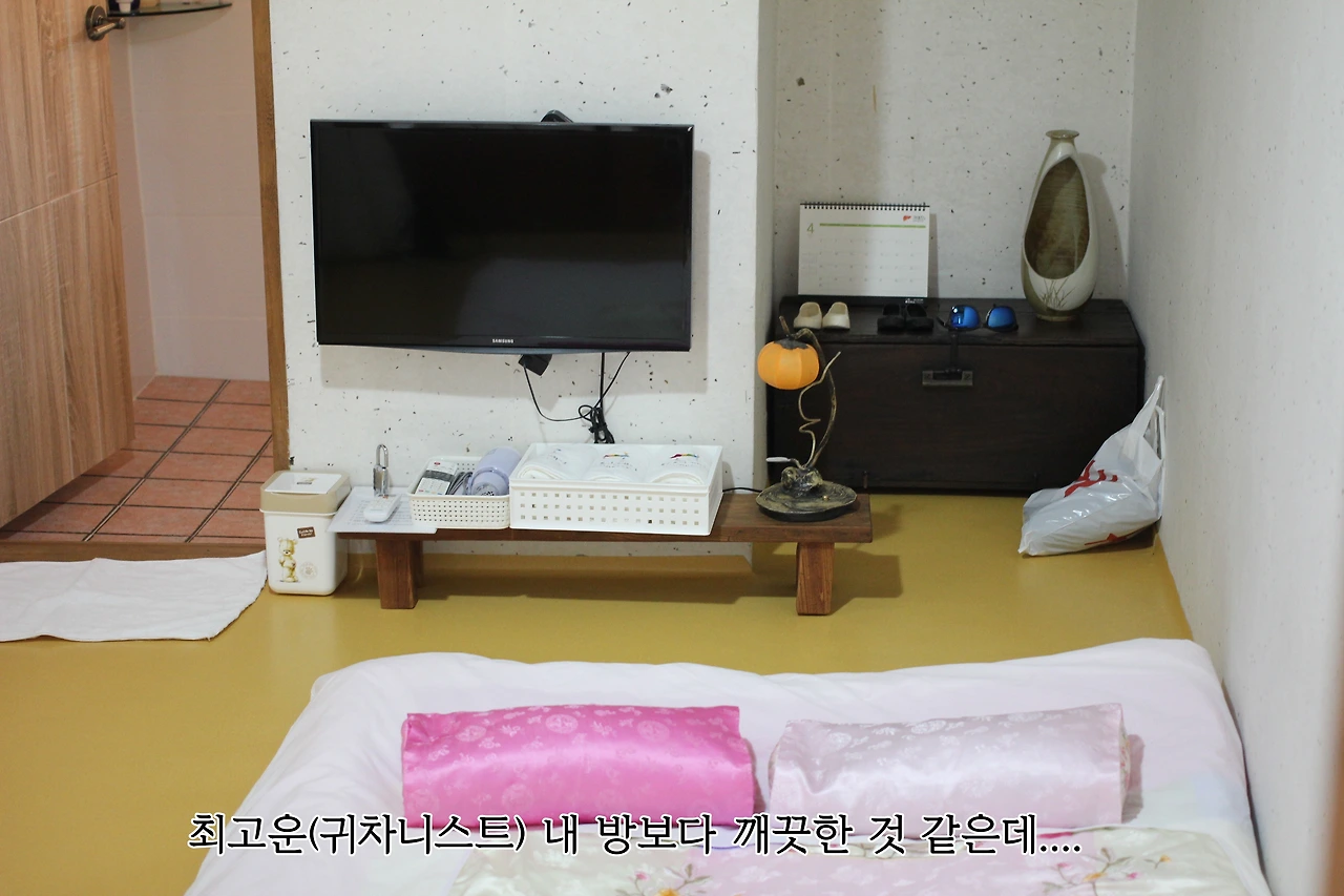 그리고 더위에 지친 김기사와 나는 다시 숙소로 돌아왔다. 한옥스테이는 처음이었는데 내 방보다 깨끗했다. 아무래도 입식 생활권보다는 좌식 생활권이 훨씬 깨끗한 건 당연한가 보다. 호스트분이 겨울 이불이 더우면 여름 이불로 교체해주신다고 하셔서 고마웠다. 우선 들어가자마자 에어컨 틀고 샤워를 했다. 끈쩍한 몸을 씻어내고 까실하고 좋은 향기가 나는 이불에 데굴 거리고 있으니 세상 행복했다. 잠시 체력도 채울 겸 낮잠(쿨)