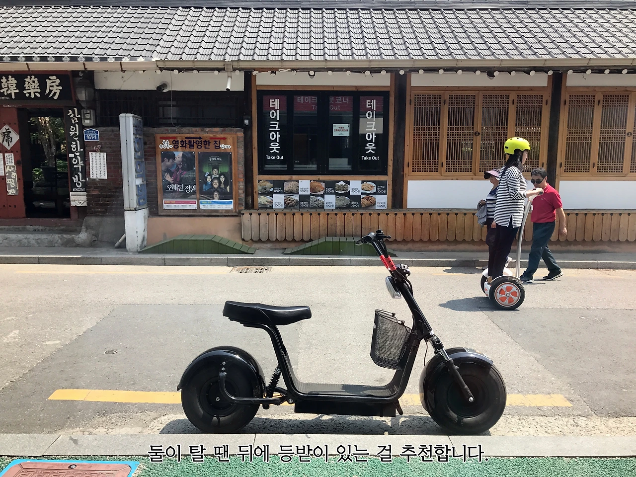 속도가 많이 나는 전동기는 도보로 이동하는 사람들과 함께 이동하기에 무리가 있고, 턴할 때도 공간을 크게 잡아먹는 단점이 있습니다. 그리고 2인용 전동기는 뒤에 등받이가 있는 모델로 빌리시길 추천드립니다.
