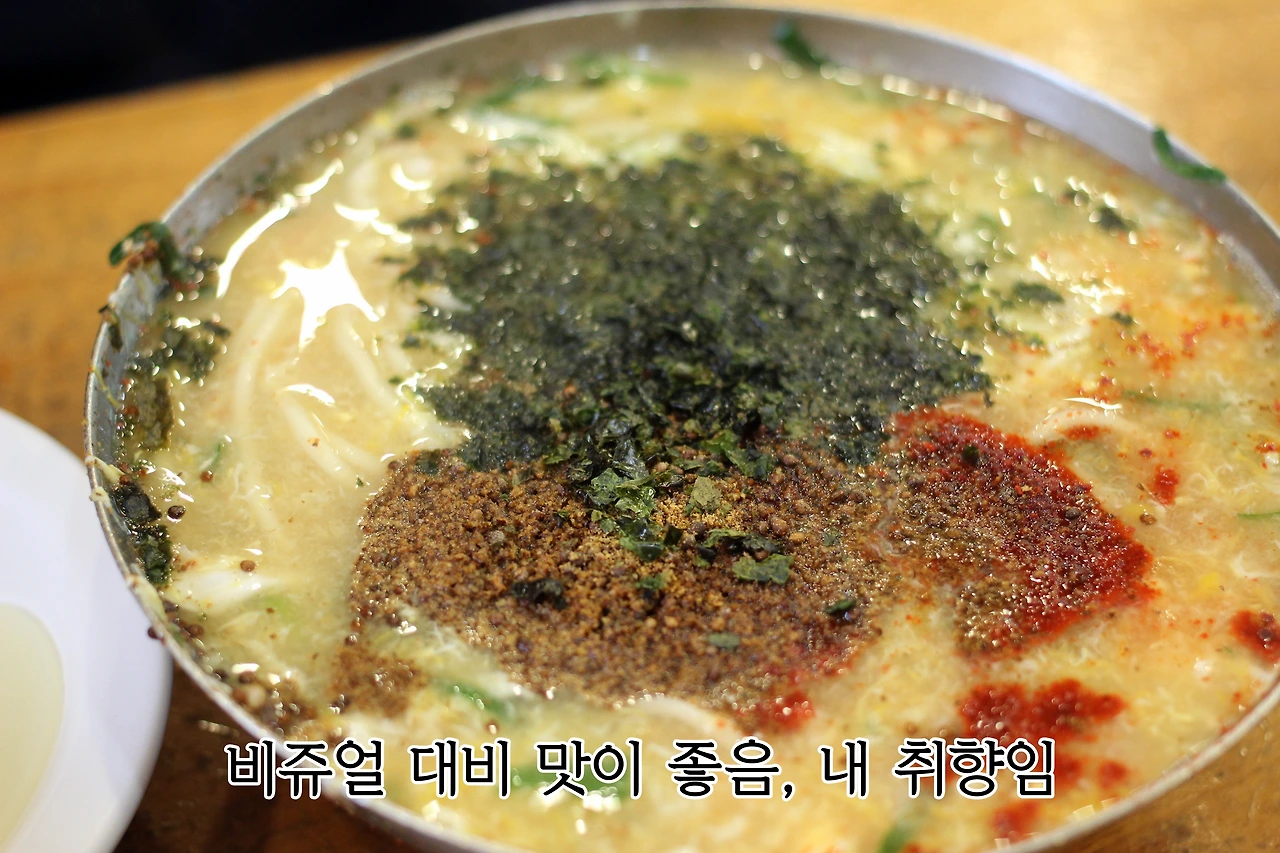 맛은 순한, 보통, 얼큰으로 고를 수 있다. 얼큰으로 갈수록 다대기가 많이 들어가는 것 같다. 새우젓으로 간을 하면 된다. 신기한 건 계란 그릇에 따로 밥을 덜어 김가루를 뿌려 비벼먹는다는 점?