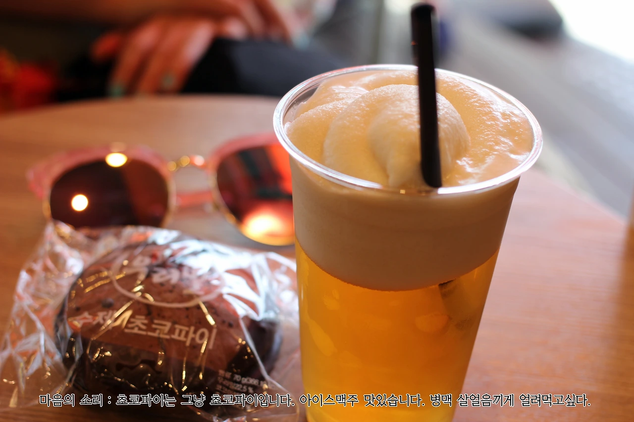 그래도 김기사 첫 전주 방문인데 하고 먹여준 초코파이. 아이스 맥주가 더 맛있었다. 그리고 맛있기로 따지면 병맥 살짝 얼려서 먹는 게 최고! 아이스 맥주를 들고 3시 버스를 타기 위해 짐을 찾아갈 준비를 한다.