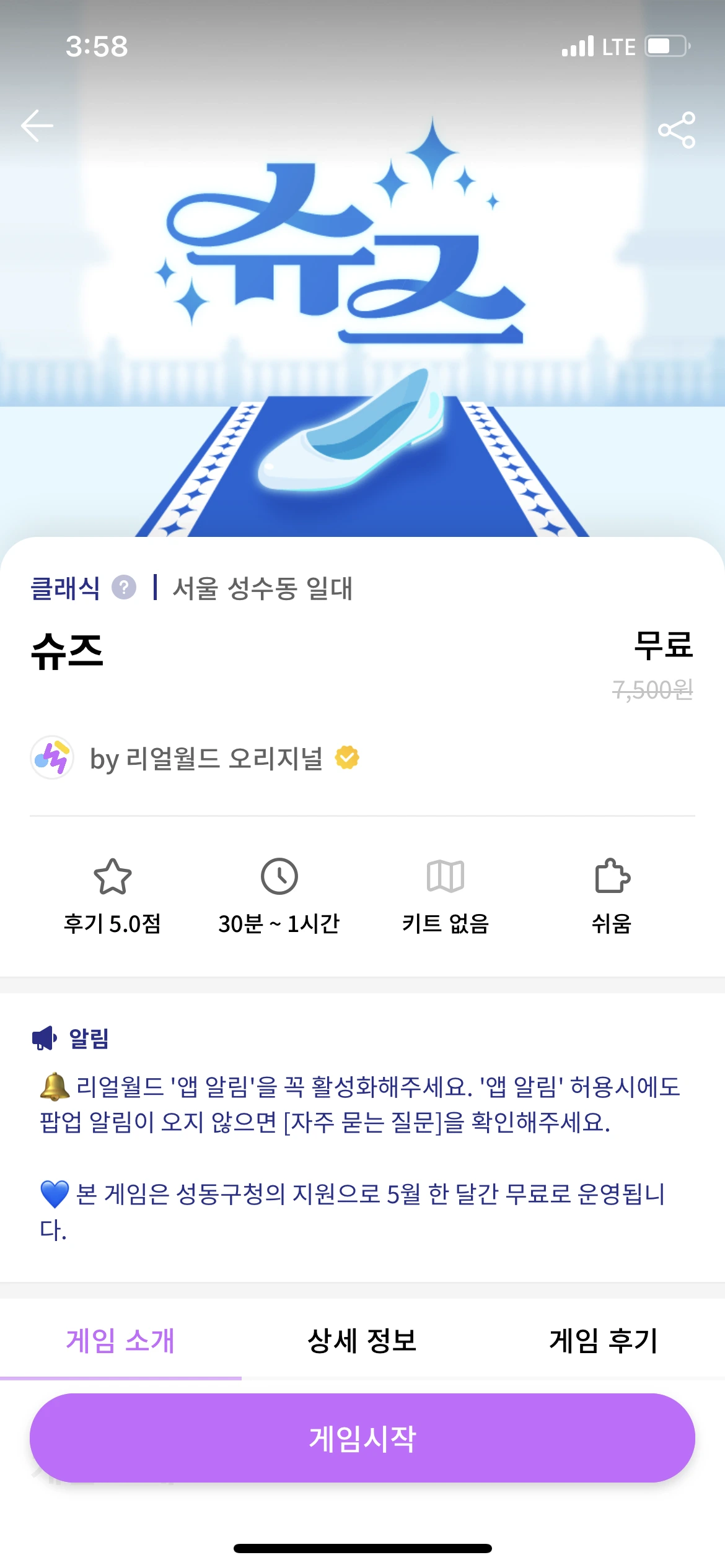 마침 5월 한 달간 리얼월드가 성동구청과 손잡고, 수제화거리를 배경으로 한 증강현실 게임 <슈즈>를 무료로 제공하는 이벤트를 했습니다. 성수역 일대 이곳저곳에 이벤트 현수막이 붙어 있더라고요. 별도의 앱을 깔지 않고 하나의 앱으로 여러 게임을 할 수 있어서 편리합니다. 별도의 설치 과정도 없어요.