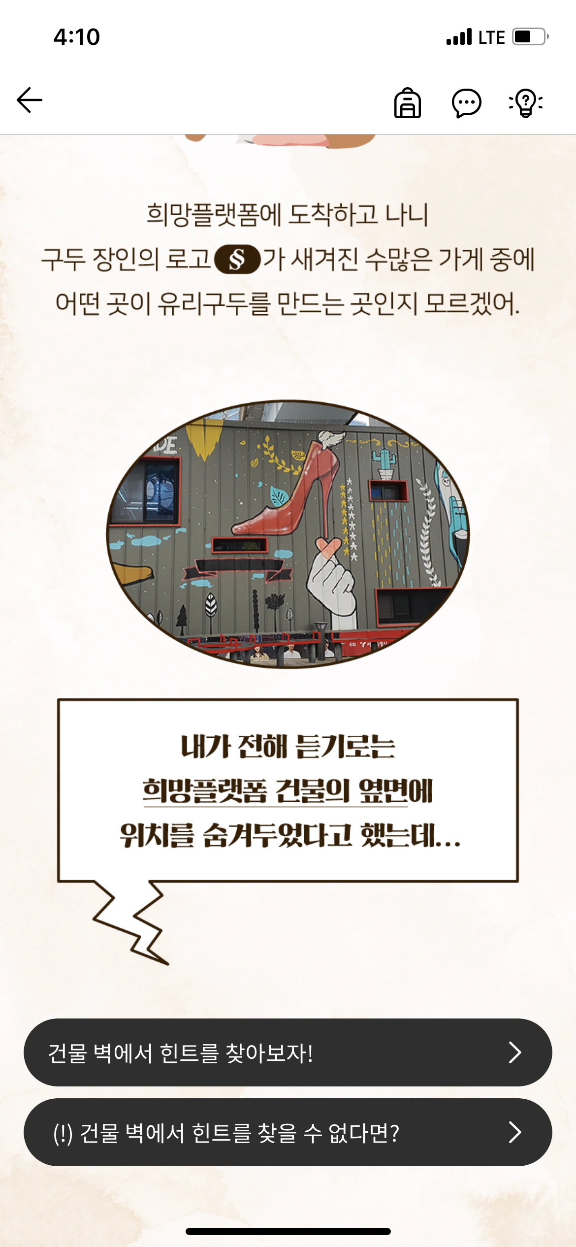 안내에 따라 퀴즈를 하나씩 풀면서 움직이다 보면, AR 기술은 '힌트'를 찾을 때 쓰입니다. 이런 기능을 쓰기 위해 이 일대를 꼼꼼하게 둘러봐야 해서, 평소에는 그냥 지나치던 곳에서 시간을 오래 보내게 되더라고요.