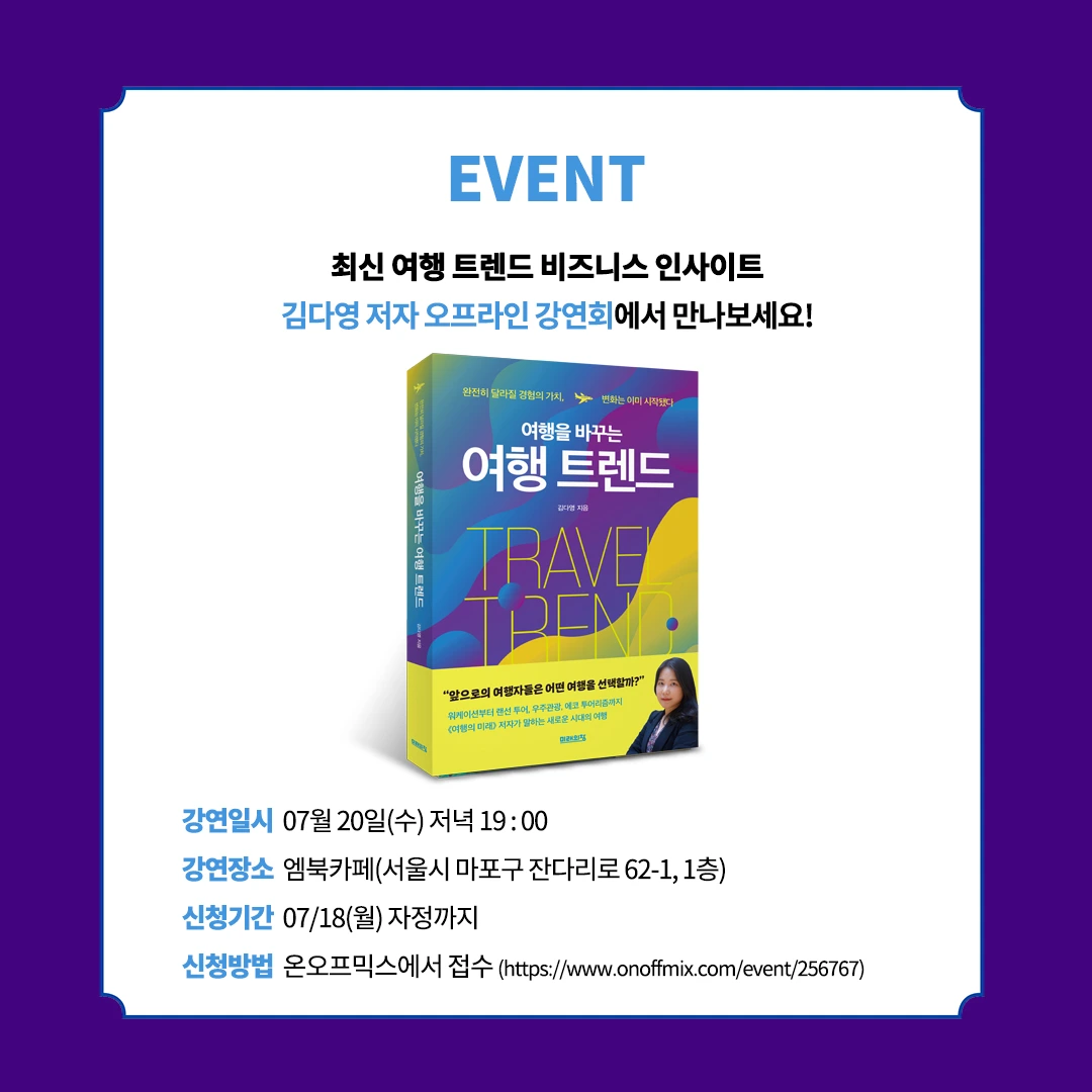 지난 저서 <여행의 미래> 출간 기념 강연 후 무려 2년만의 북토크인만큼, 완전히 새로운 인사이트 가득 담아 준비할 예정입니다. 이날 뵙고 반갑게 인사나눠요!