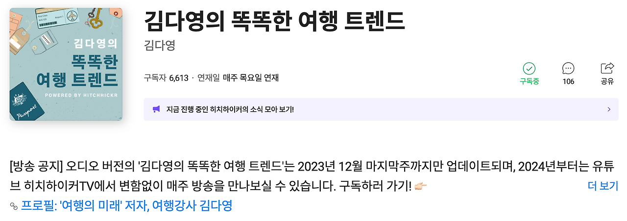 시작 3개월 만에 팬데믹을 맞으면서, 이 방송은 대전환점에 선 여행산업의 변화를 짚는 새로운 역할을 하게 되었다. 그런데 여행이 아닌 '여행산업'이라는 니치한 주제를 다루는데도, 매주 성실히 운영한 덕분인지 구독자는 계속 늘어 6천 명 대까지 올라섰다. 종영한 지 2년이 흐른 지금까지도 여행업계에서는 나름 전설(?)처럼 회자되는, 청취자였다고 인사를 해주시는 방송이기도 하다.