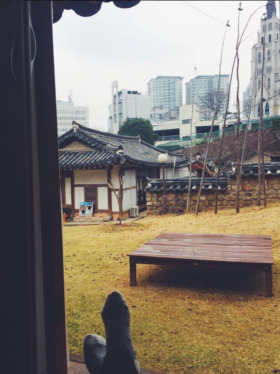 계산성당 앞 구불구불한 골목을 돌고 또 돌고, 한참을 헤매어 들어가니 드디어 커다란 나무 대문과 마주 섰다. 미리 담당자에게 안내받은 대로 문을 열자, 묵직한 나무 대문 너머로 아담한 안뜰이 펼쳐졌다. 정면에 보이는 본채 수강당 옆으로 띄엄띄엄 떨어진 작은 독채 중 한 곳이, 오늘 밤을 보내게 될 한별당이다.
