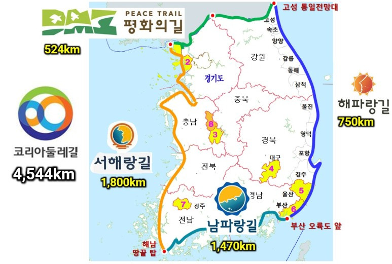 내년 봄에는 DMZ 평화의 길 524km가 열릴 예정이다. 지금은 경기권 DMZ 접경지에만 경기평화누리길이 운영되고 있지만, 내년 초까지 강원도 구간을 횡단해 고성 통일전망대까지 이어지는 것이다. 이렇게 DMZ 접경 지역 전 구간이 연결되고 나면 대한민국을 한 바퀴 도는 코리아 둘레길이 완성된다. 해파랑길부터 동서남북 4개 길 거리를 모두 합치면 총거리가 4,500km를 넘긴다.