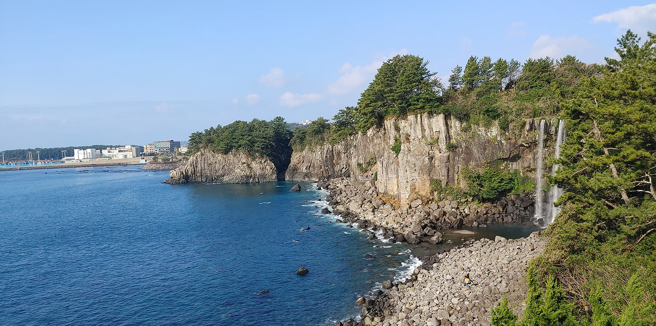 우리나라 사람 열 명에게 ‘국내 최고의 폭포가 어디라고 생각하느냐?’고 물어보면 아마도 압도적 한두 군데가 없이 중구난방일 것이다. 좁은 땅이다 보니 남미나 북미대륙처럼 역동적인 지형들이 많지 않고 단조롭기 때문이다. 그러나 제주 정방폭포를 국내 최고로 답하는 이들도 열에 두어 명은 분명히 있을 것이다. 특히 ‘바다로 곧장 떨어지는 폭포’ 또는 ‘동양 유일의 해안 폭포’ 등 네이버나 구글 지도상에 올라 있는 수많은 리뷰들을 훑어보면 정방폭포의 존재감을 새삼 실감하게 된다. 천제연과 천지연 등 인근의 형제 폭포들 덕분에 덩달아 위상이 올라가는 측면도 있을 것이다.