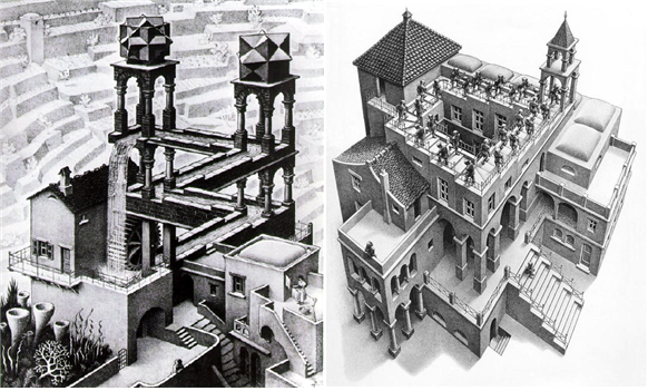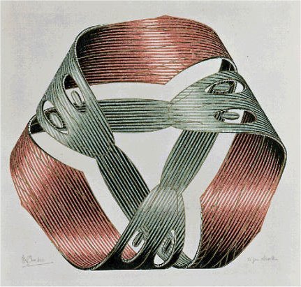 <펭귄 하이웨이>의 철학적, 미학적 모티브는 여기서 그치지 않는다. 영화 속에서 은유적으로 표현되는 세계관은 네덜란드의 판화가 에셔의 아이디어를 그대로 차용한 듯 보이는데, '안이라 생각했던 부분이 밖이 될 수 있다'는 말 자체가 명백히 <뫼비우스의 띠> 개념의 변용이기 때문이다. 일종의 닫힌 생태계라 할 수 있는 숲 속 개울물이 그 속에서 끊임없이 순환하고 있다는 우치다(아오야마의 친구 2)의 발견 또한 에셔의 <폭포>나 <계단 오르내리기> 등의 역설적 작품들을 떠오르게 한다. 에셔는 뫼비우스의 띠에 깊은 관심을 보였다. 그의 작품 <뫼비우스의 띠>의 모티브는, 아래 이미지에 보이는 대로, '경계'가 아닌 '순환'이다. 안과 밖의 경계를 허무는 그의 작업은 곧 3차원 현실에서 구현이 불가능한 순환 이미지를 2차원의 평면에 나타내는 작업으로 옮아갔다. 그의 작품 <폭포>를 보면 흐르는 물이 폭포가 되어 떨어지는데, 아이러니하게도 그 물이 다시 돌고 돌아 폭포 위쪽으로 흘러간다. 그리고 이는 영화에서 우치다가 발견한 숲 속 개울물의 흐름과 정확히 일치한다. 우리가 아는 과학적 법칙에 명백히 위배되는 현상이지만, 진실의 영감이 언제나 엄밀한 과학적 검증을 필요로 하는 것은 아니다.